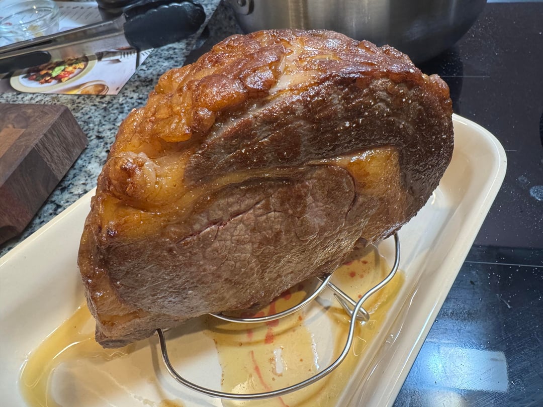 The fat looks a little underdone so wasn’t melting taste through the roast. I would also suggest putting garlic in the roast itself before bagging and cooking. I cut slits between the fat and meat and shovel slivers of garlic the pockets. I used about 2.5 heads of garlic per roast this year but my family loves garlic, you can probably cut that to 6-8 cloves.