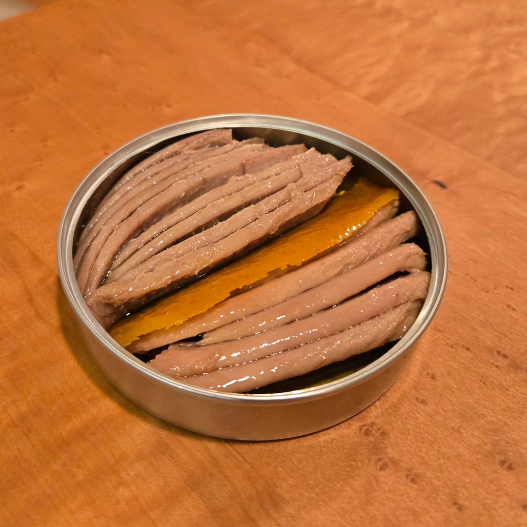 With intel from u/Tinned_Fish_Tyler , this is the can I chased down at my local QFC (after learning from a few other folks here who said it was available at Kroger's stores). The fish is average for yellowfin ventresca — very firm, rich meat that can't be shredded easily with a fork — but the real star is the Spanish orange flavor. Unlike most "lemon" sardines with nearly undetectable lemon flavor, this tuna actually has a delicious and distinctive orange zing (that darker piece in the middle of the can is a slice of orange peel).