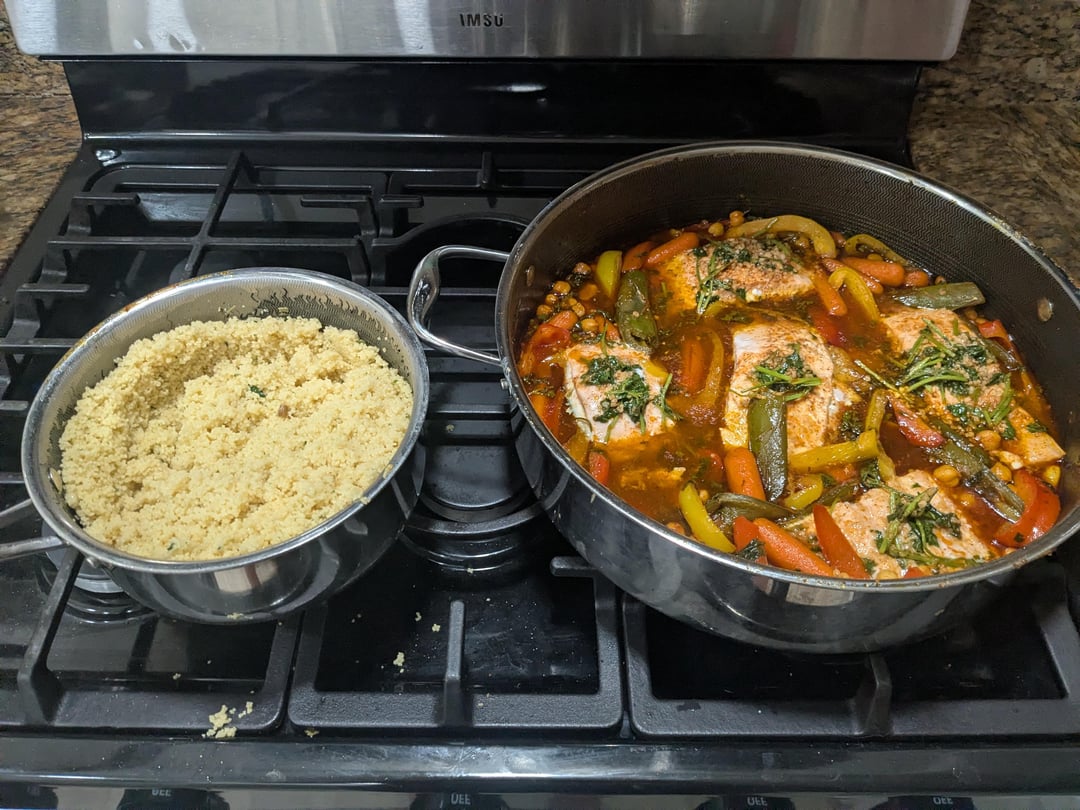 7. **Add Fish** Arrange fish around vegetables, cover, and cook **10 minutes**.