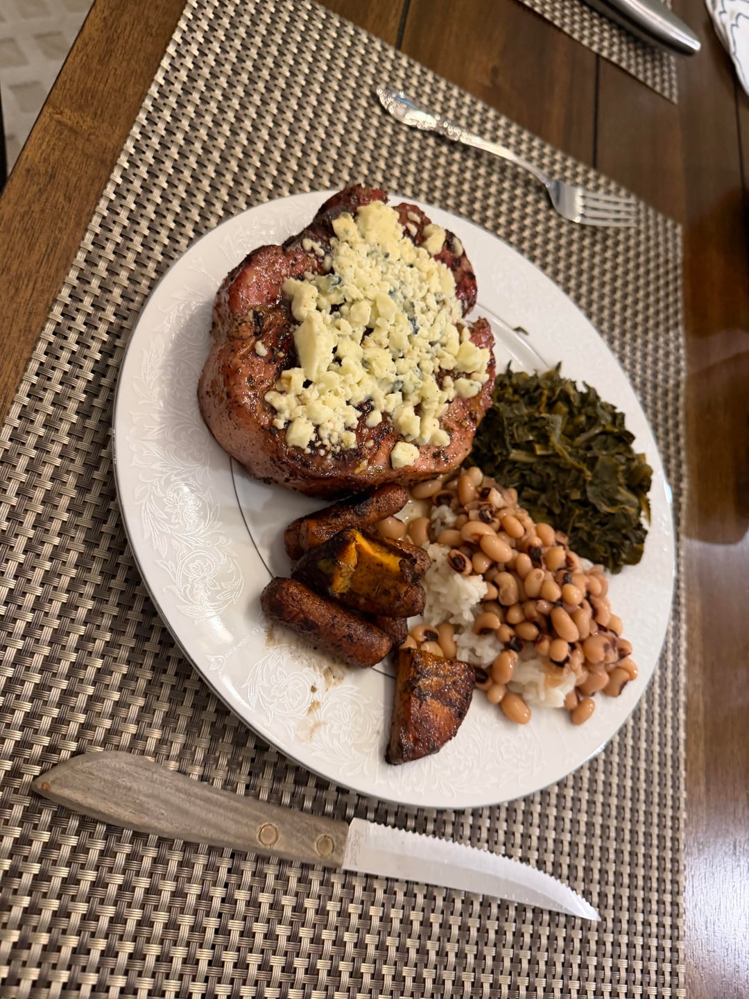 Got some bone in center cut pork chops for News Years day. Reverse seared and topped with blue cheese so good!