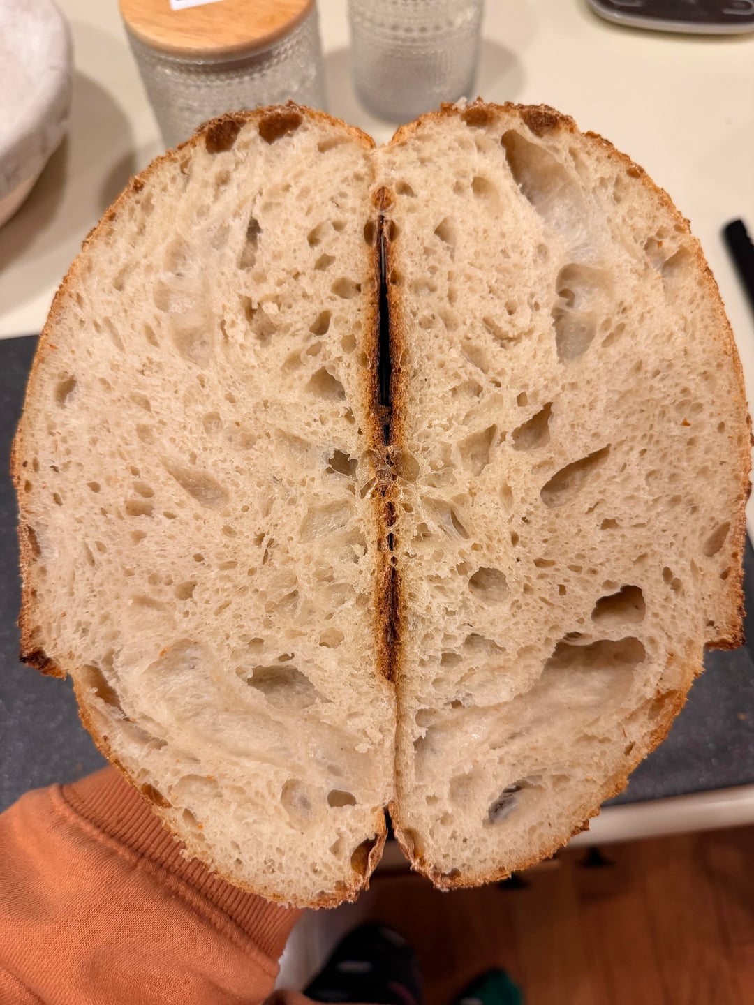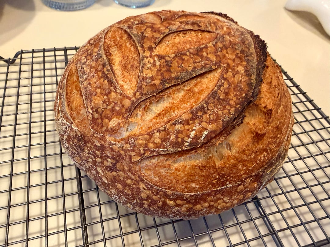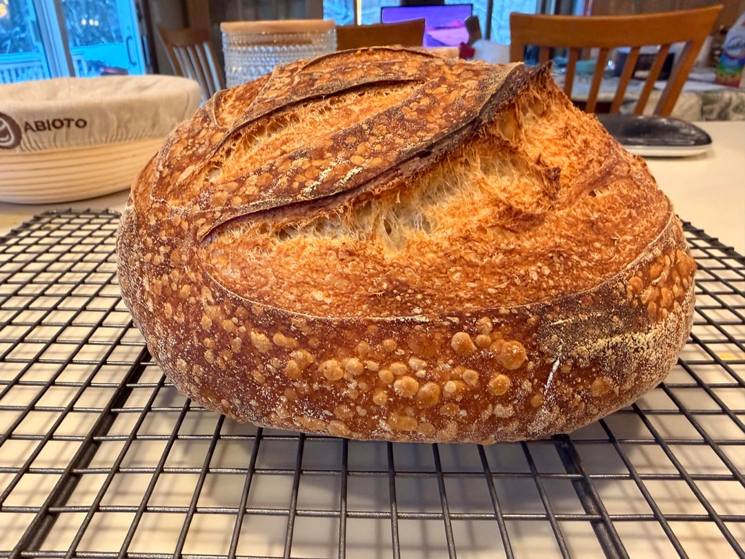 Beautiful scoring. Very nice blistering — are you at high altitude, or did you add ice to the preheated Dutch oven? Great looking crumb — although if you prefer Not to have large holes in your sliced bread, look for abnormally large bubbles while shaping and pop ‘em with metal scraper. Other questions to improve or experiment: (1) Did you autolyse the flour and water alone for 30+ minutes before adding the starter and salt? (2) Did you do a preshape as well as a shape? (3) Over your next few loaves, do you notice any significant differences when you use different flour mixes in your starter and/or dough? Such as increasing the percentage of whole grain flours from 0% to 10% to 20% and even 30%, or experimenting with different hydration levels.