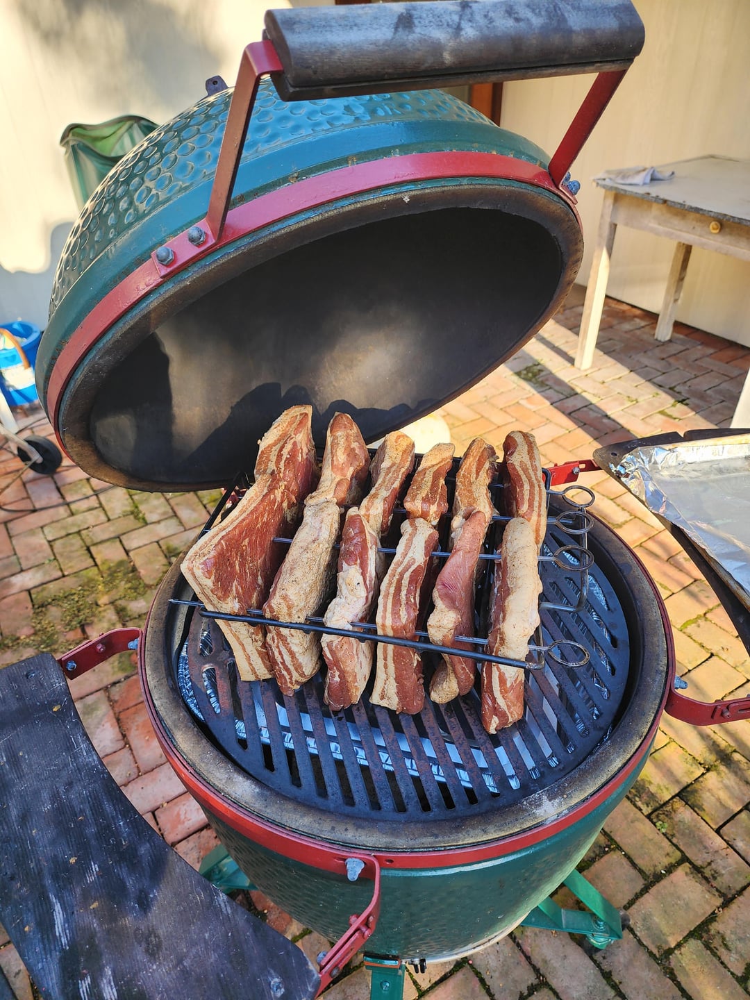 I'm currently COLD smoking bacon over an A-maze-n pellet tray, But I'm not getting enough heat rise to stabilize the draft through the BGE.