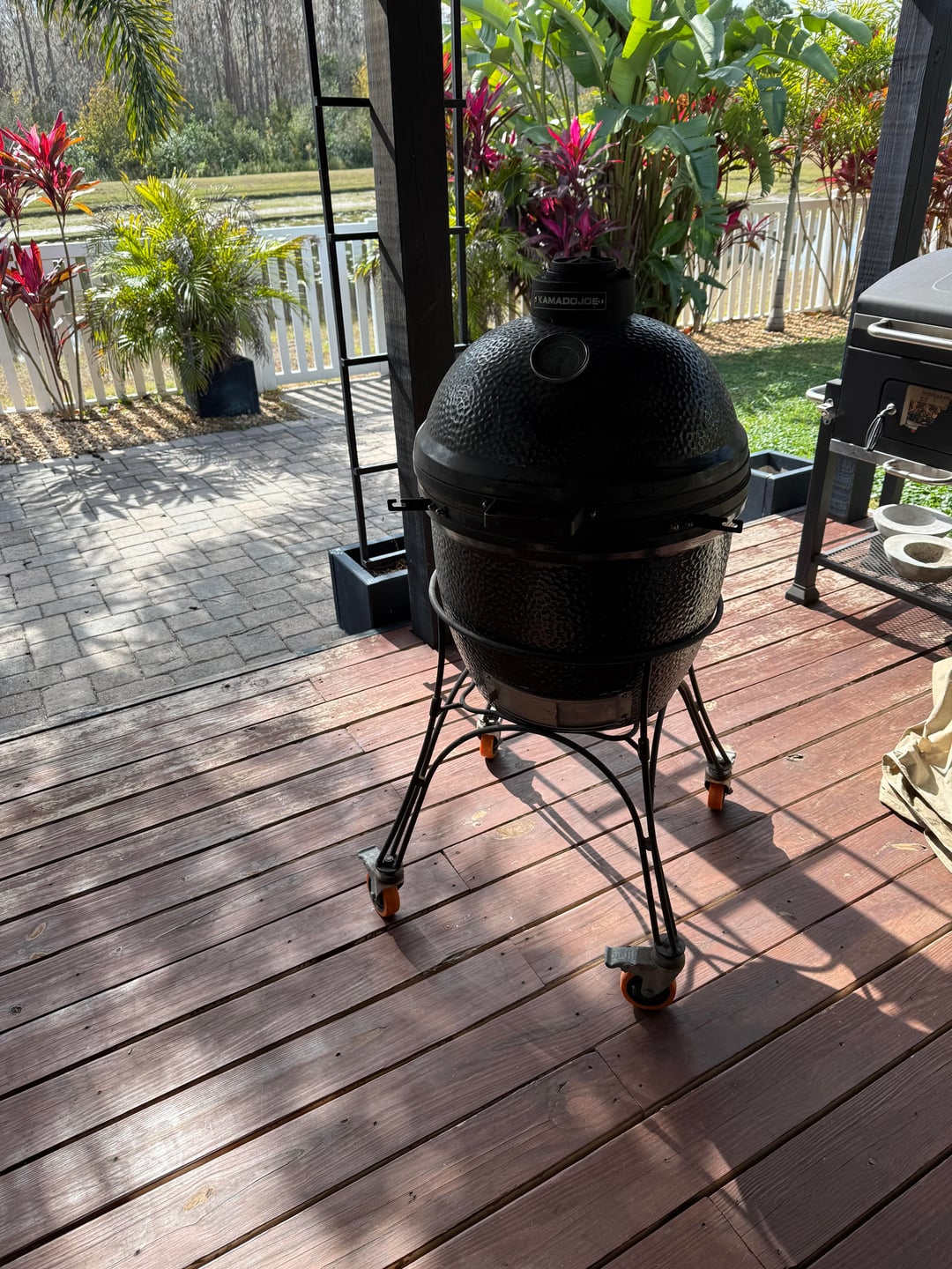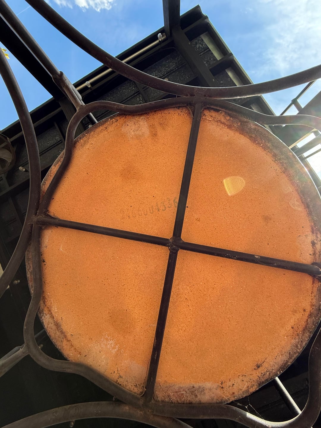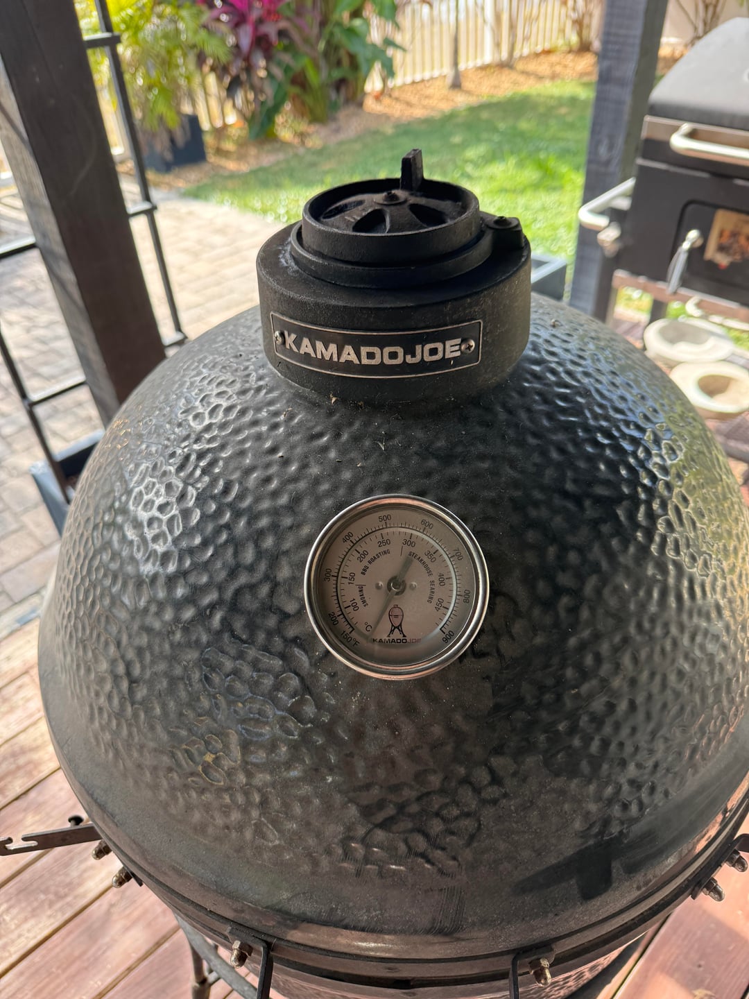 No real markings other than the stamped nameplate on the cast chimney cap and logo in the thermometer. It’s all black glazed ceramic outside. 18” cooking grill/ grate. I picked up the stand for free from fb marketplace a while back.