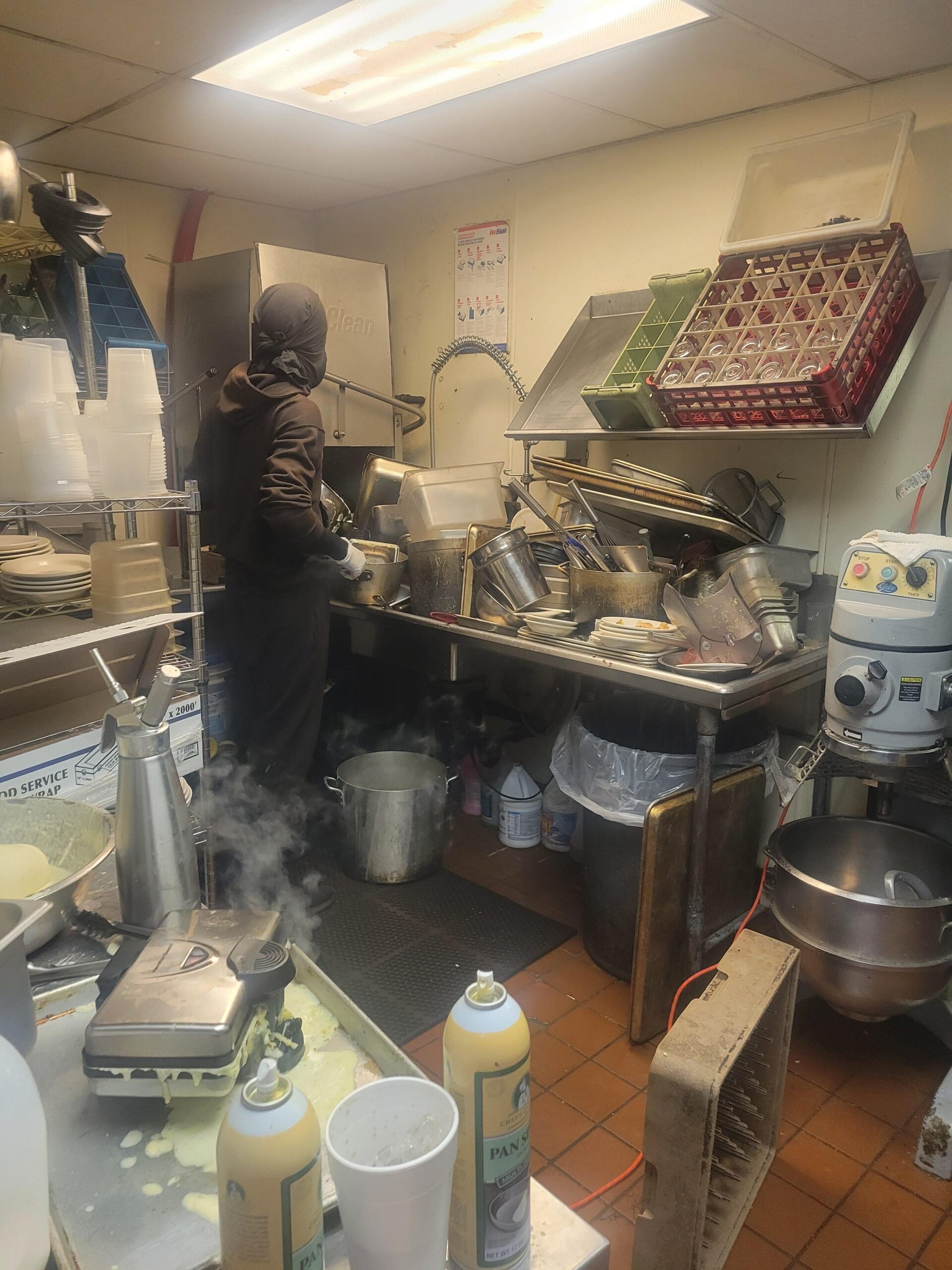 How does it get this bad? Is prep not doing their dishes? Is a Dishie scheduled too late? Can the person cranking out crusty ass sloppy waffles not put some dishes away?