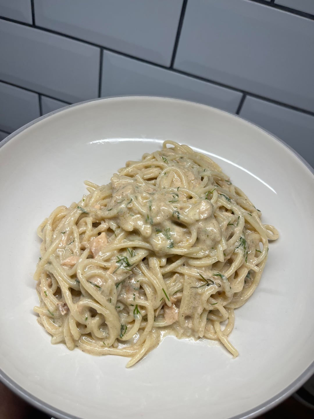 delicious yet again! sour cream and dill are what made the pasta look like that! also added allspice and gently sautéed sliced garlic in the oil from the tin. super yummy quick dinner 🙂