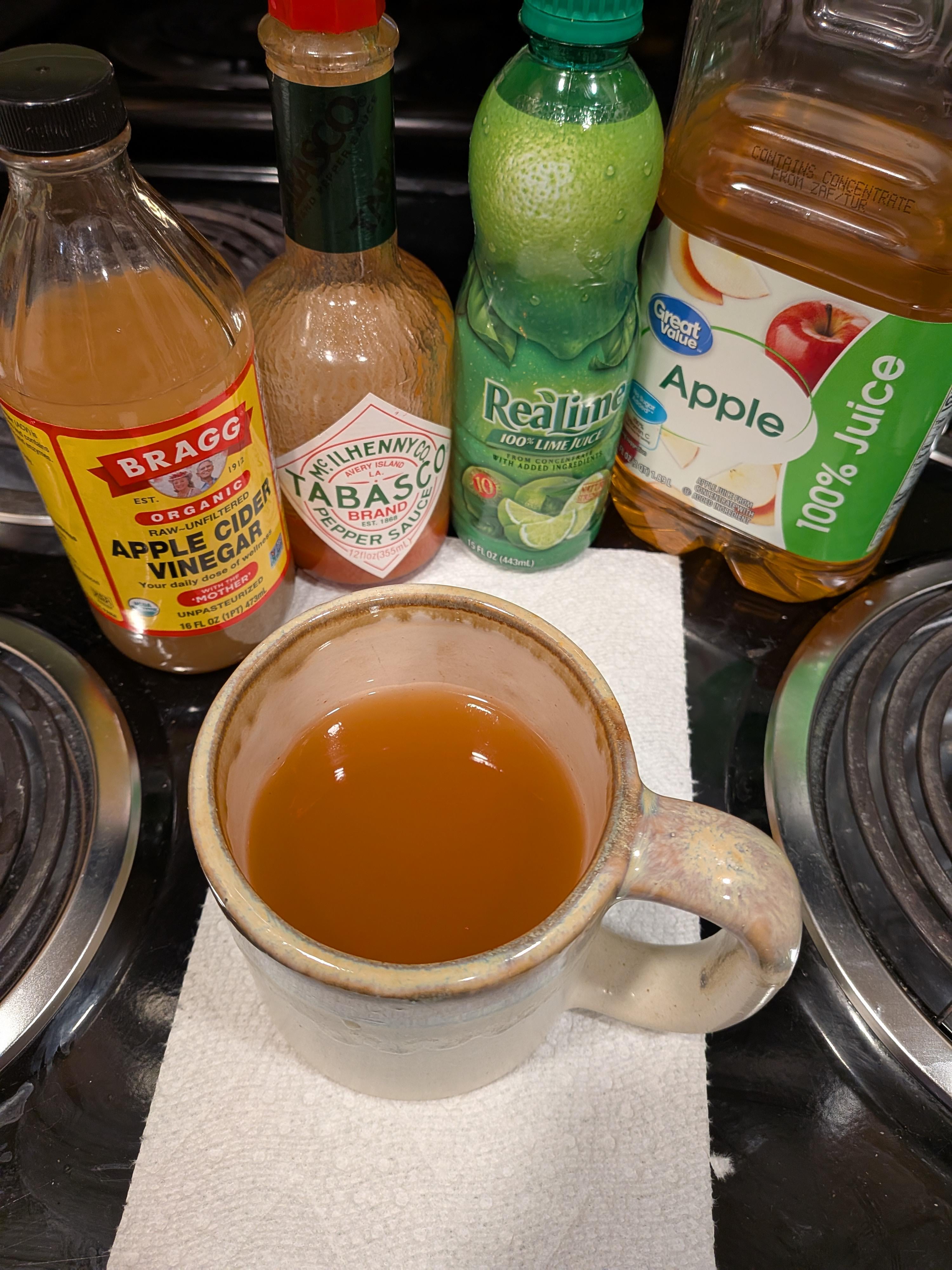 I got a panacea drink I mix up when I’m sick that has most of that except apple juice plus chicken stock, braggs amino acids, garlic, and olive oil.  Cleans me right out, sinuses to bowels.