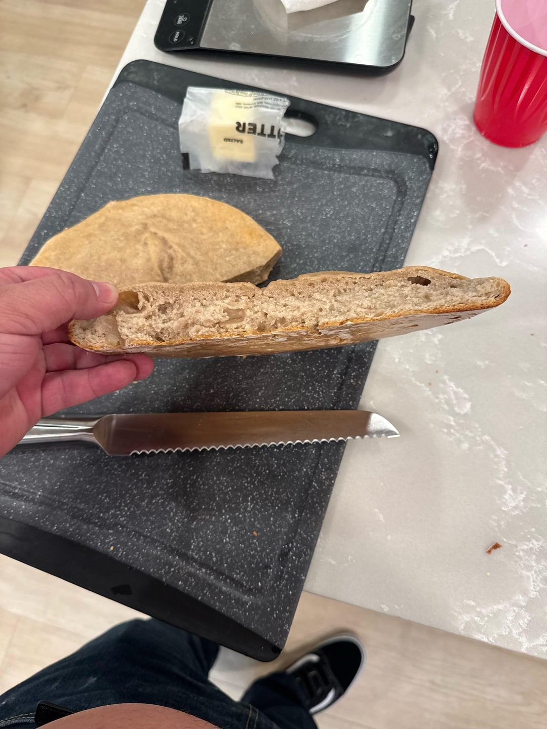 The first loaf I followed a guidebook and I did not use a weight scale. I used measurements. I used 1/2 cup of starter, one and a half cups of warm water, 2 teaspoons of salt, and 4 1/8 cups, all purpose unbleached flour. After mixing it together, I let it sit for an hour. Then I did two stretch and folds every half hour two times. After that I did two coil and folds every half an hour for one hour. So basically I did stretch and fold, coil and folds, four times in two hours. Then I let it bulk ferment, for four hours. Then I put it in the refrigerator for 12 hours. This was all recommended by the guide booklet. I baked it in an aluminum Dutch oven at 450°. I baked it for 40 minutes with the lid on and 20 minutes with it off. This first loaf came out pretty decent on the outside, but when cut open, there was a lot of big holes. Per the guide, it said I under fermented it. Didn’t have much of a taste either.