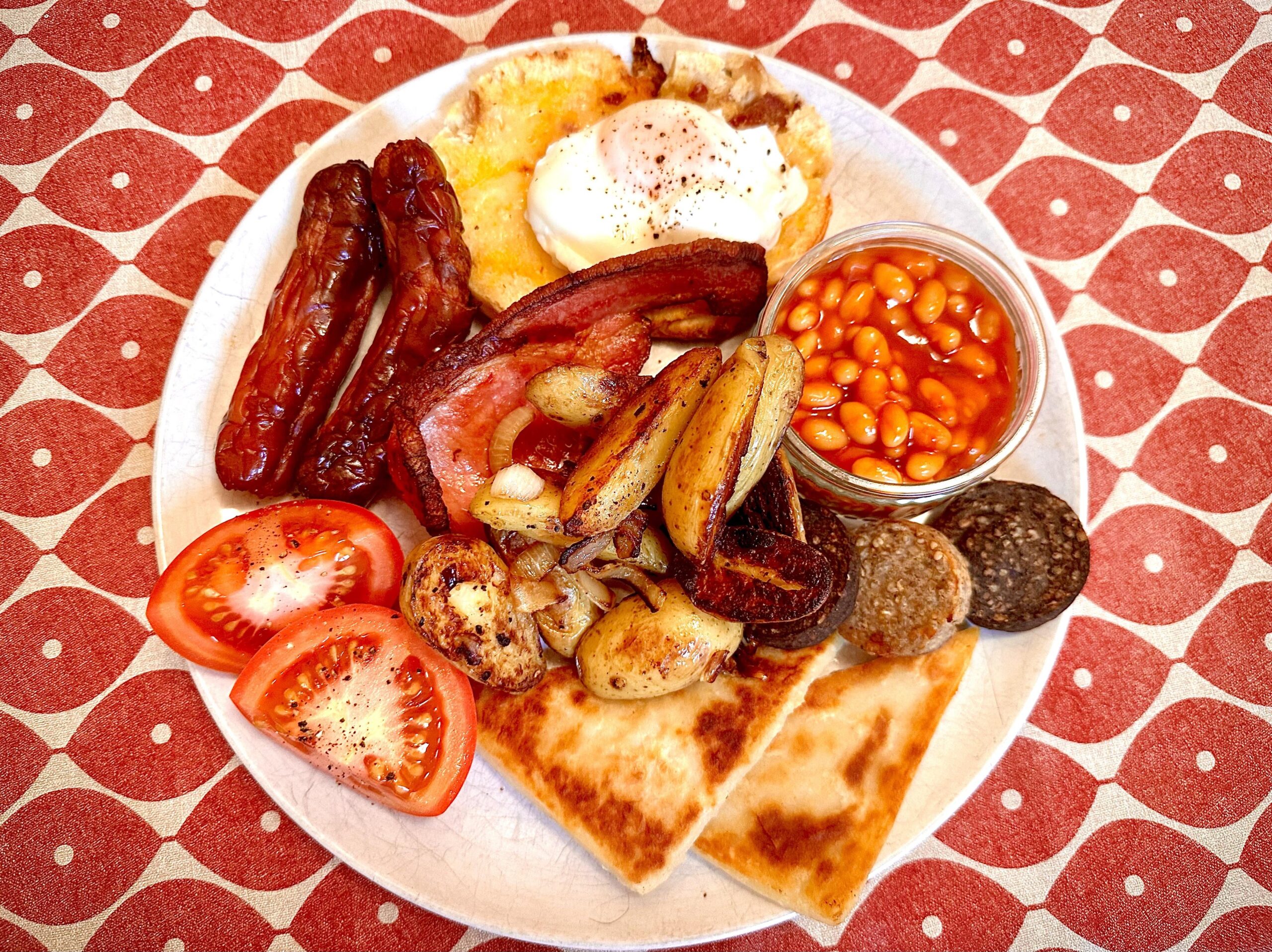 Sausage, bacon, poached egg, sauté potatoes with onions, potato bread, bacon & cheese soda bread, black and white pudding, tomato (raw), bbq beans…..sadly didn’t have mushrooms!!