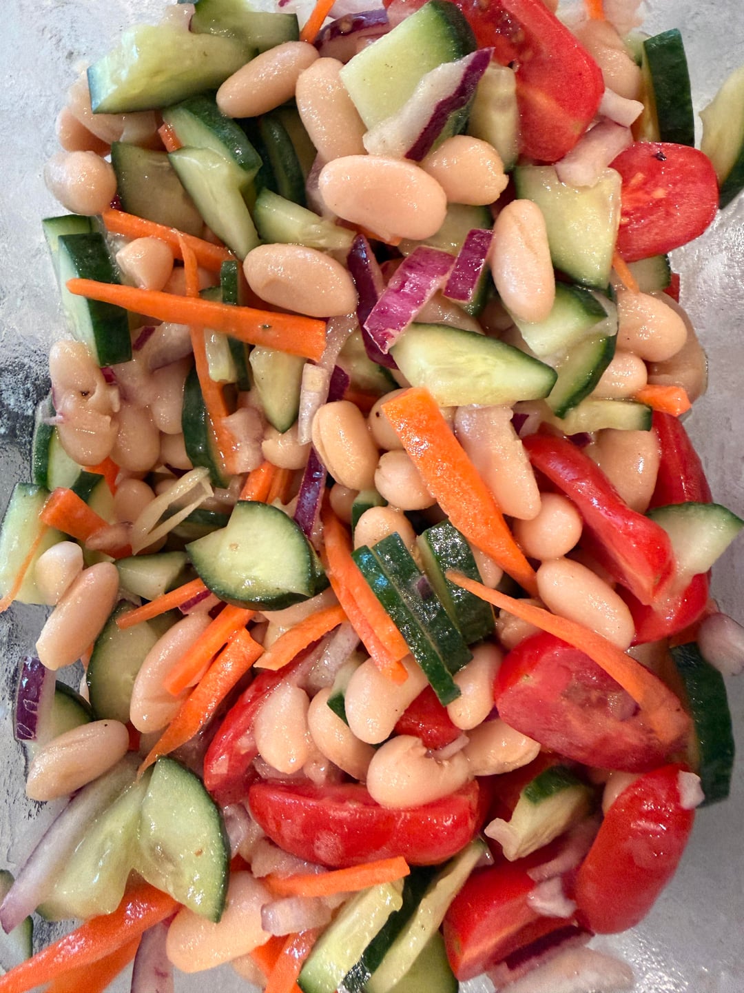 Pic 2: white bean salad. Chop up your veggies- I did cucumber, cherry tomatoes, carrots and red onion with a drained/rinsed can of cannellini beans. Whisk together a sauce: mine is: