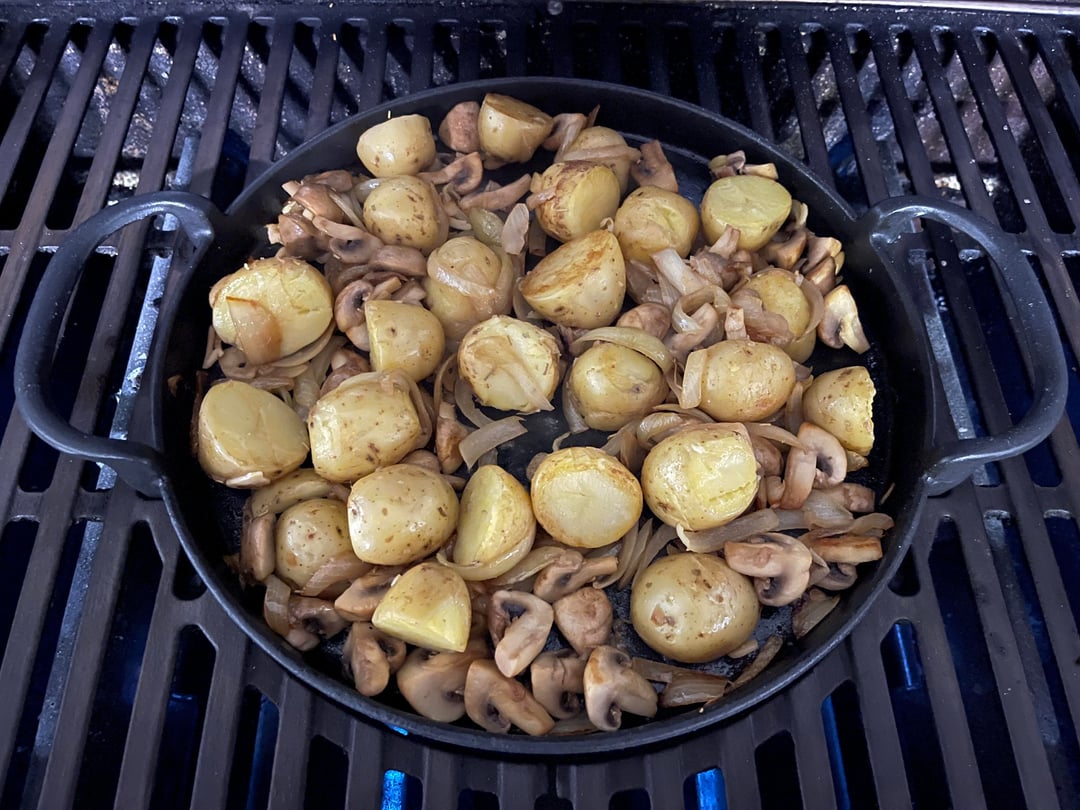 Eye of round roast beef over hickory on the KJJ and garlic spuds, shrooms and onion on the Weber griddle panby Siucra_Ray Dining and Cooking