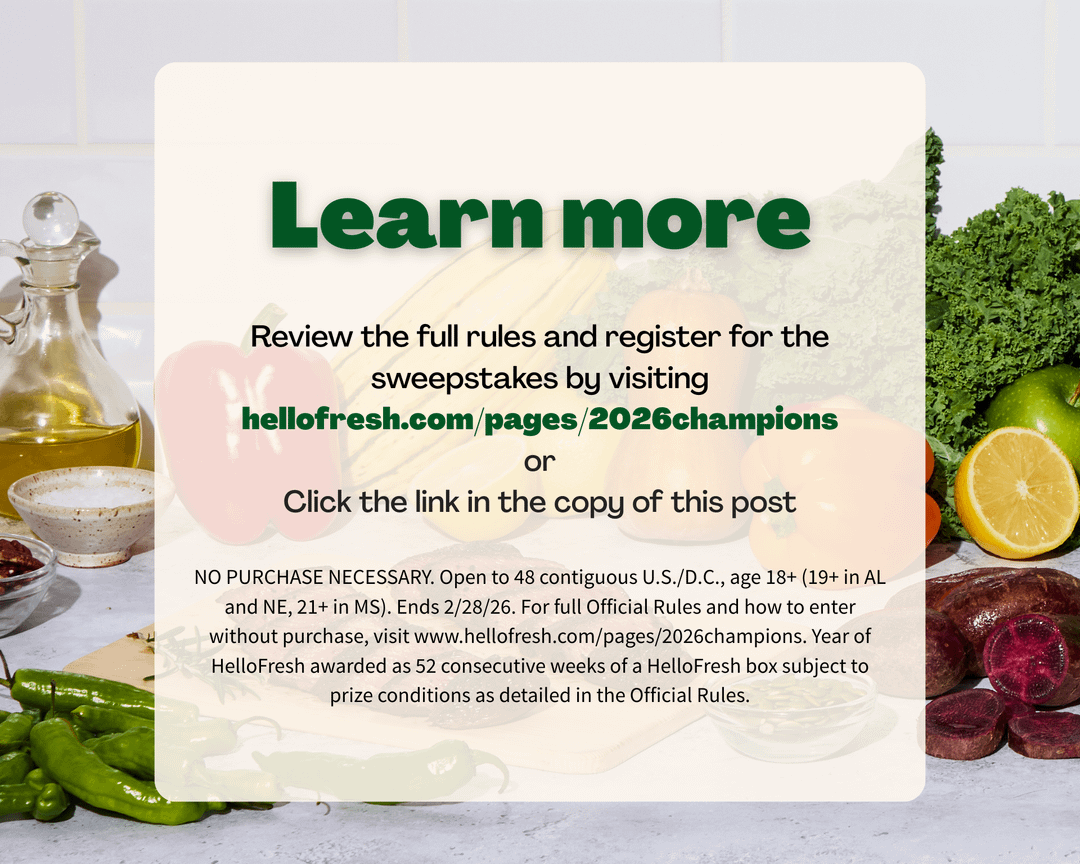 *NO PURCHASE NECESSARY. Open to 48 contiguous U.S./D.C., age 18+ (19+ in AL and NE, 21+ in MS). Ends 2/28/26. For full Official Rules and how to enter without purchase, visit www.hellofresh.com/pages/2026champions. Year of HelloFresh awarded as 52 consecutive weeks of a HelloFresh box subject to prize conditions as detailed in the Official Rules.
