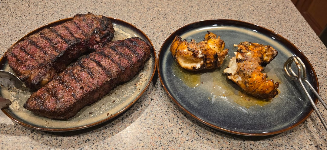 Wagyu strip steaks and lobster for dinner tonight. If I had to pick a last meal, this would be it!