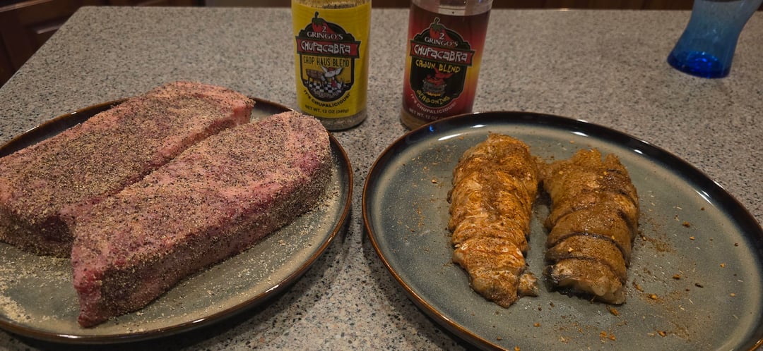 Wagyu strip steaks and lobster from H-E-B, steak seasoned with 2 Gringos Chupacabra Chop Haus and lobster seasoned with their Cajun seasoning then smoked and seared over mesquite. Served with roasted brussel sprouts and mini potatoes. One of the best meals I've ever made or had anywhere!