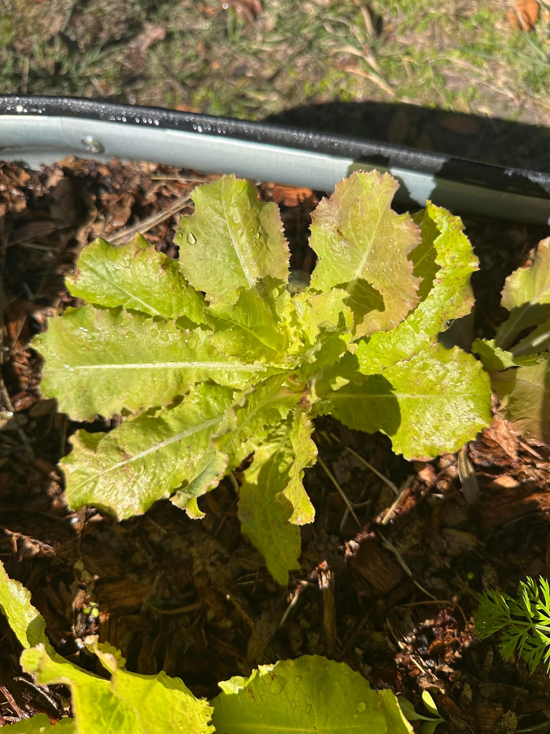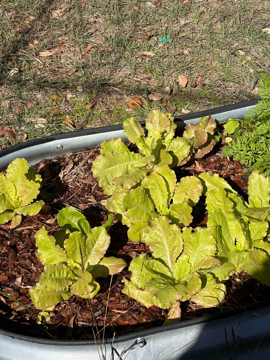 I believe it’s green towers romaine. I’ve been growing it since beginning of October and it has always struggled. I haven’t really gotten a real harvest from it because it always looks like this. It turns really brown. It has been very slow growing. The carrots next to it are doing great. I thought I was over watering because I was watering daily but then I went to every other day with no change. I’ve tried fish emulsion fertilizers every few weeks. That area really only gets about 3-4 hrs of full sun.