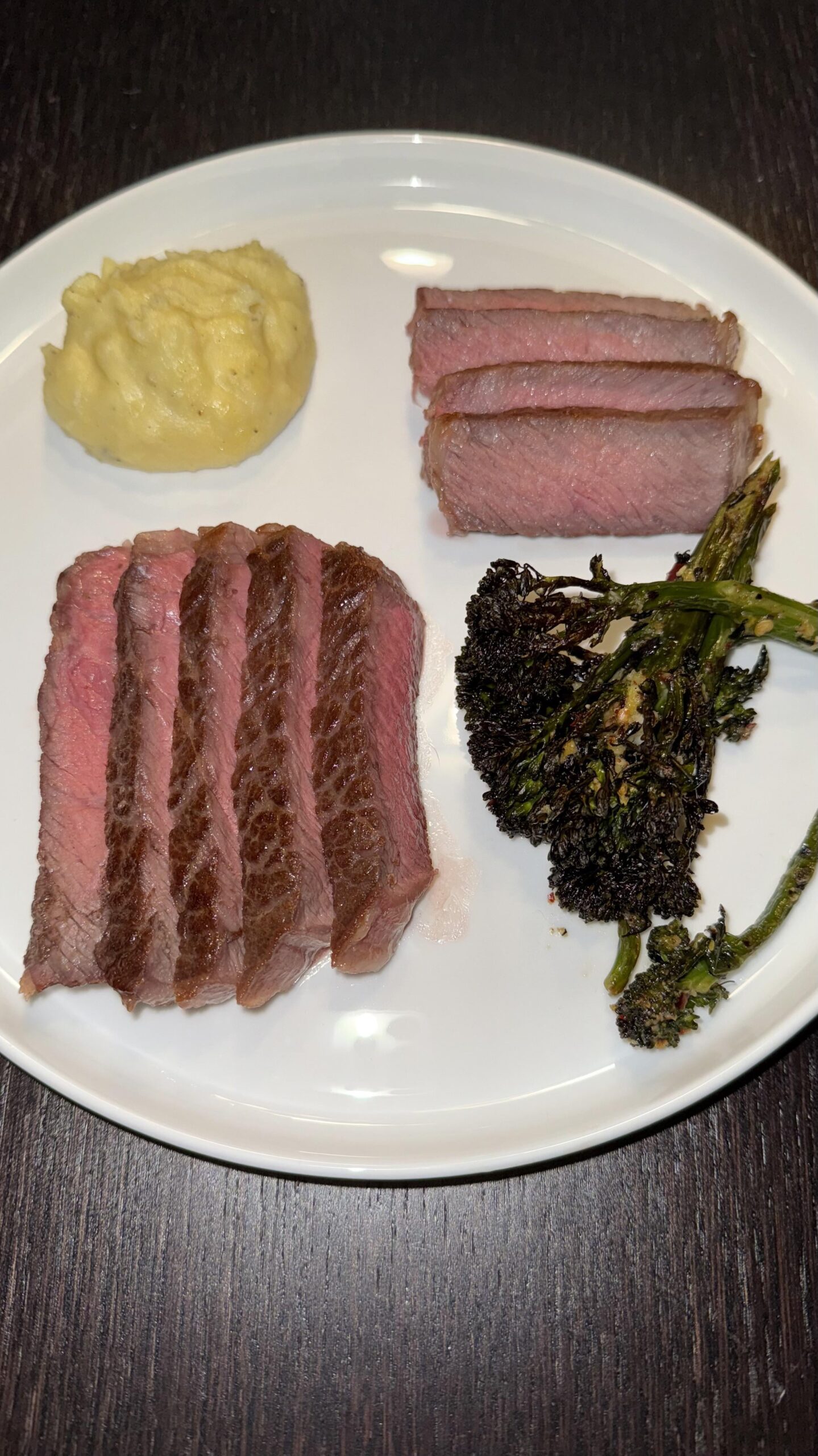 I got some new plates recently so wanted to play around with the plating. Left is ribeye, right is strip! Potatoes are from scratch, and some broccolini