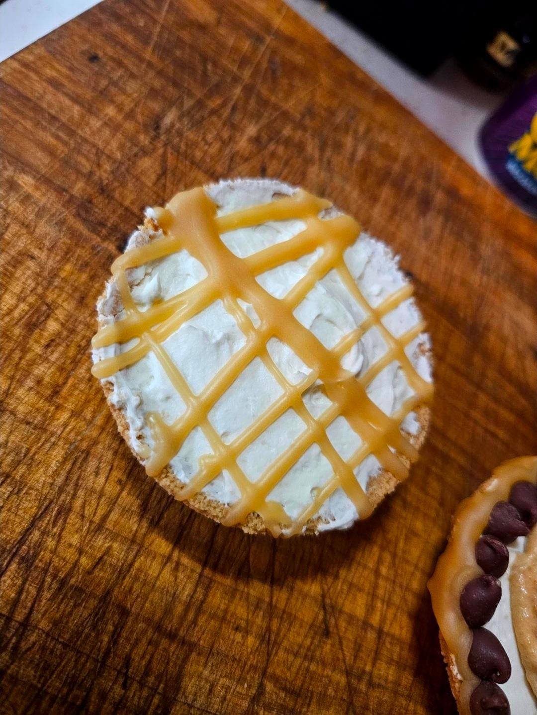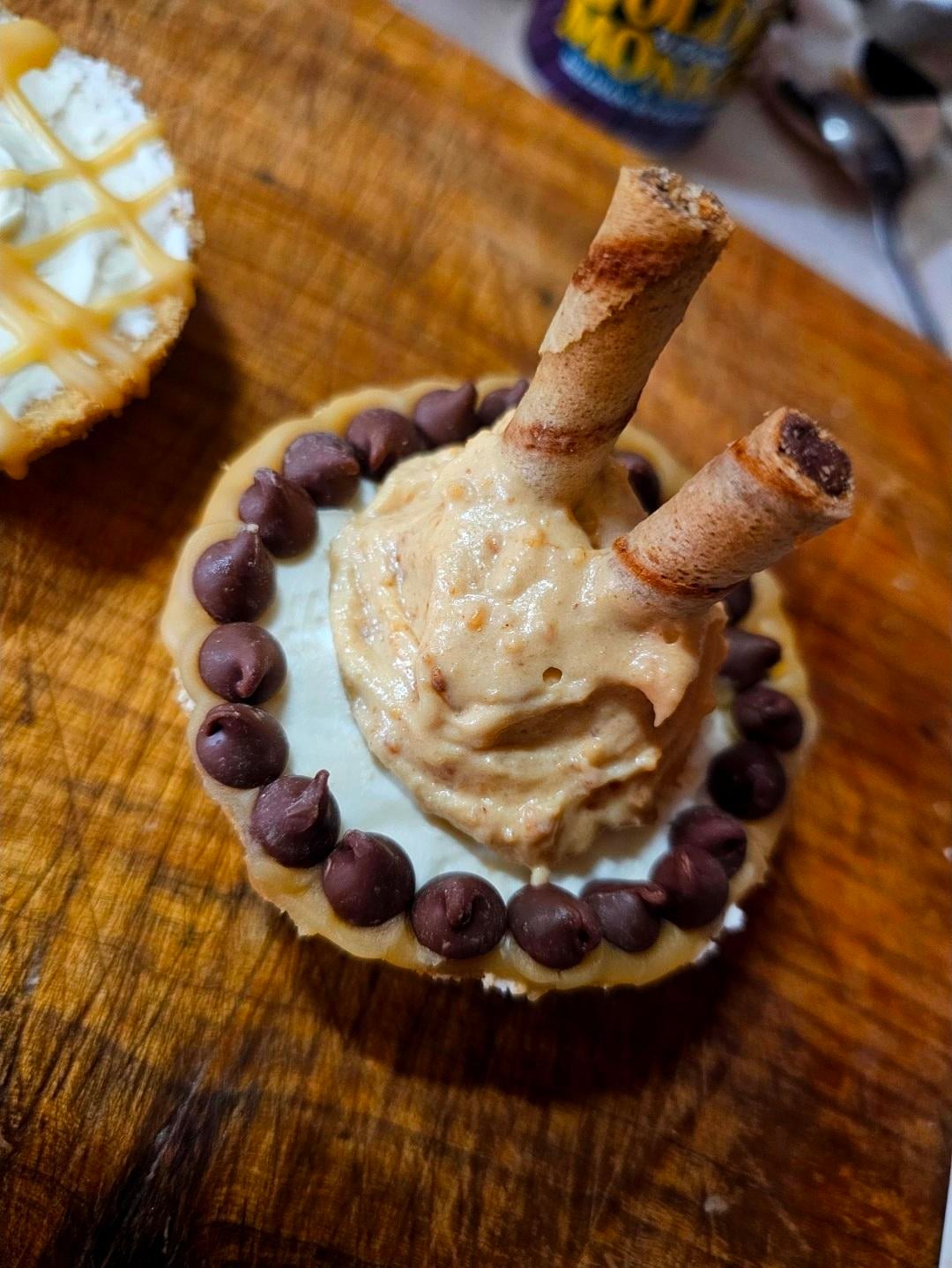 Once everything is set and done, drizzle the edge with caramel to hold chocolate chips in place, and garnish with a fancy cookie in a spoonful of mousse 😁 or if you don't like peanut butter and have a chocolate allergy, just drizzle some caramel 😅