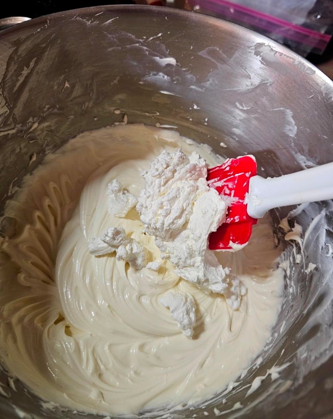 In a separate bowl, whip 1 cup whipping cream until it gets stiff and peaks form, then fold that into the cream cheese mixture.