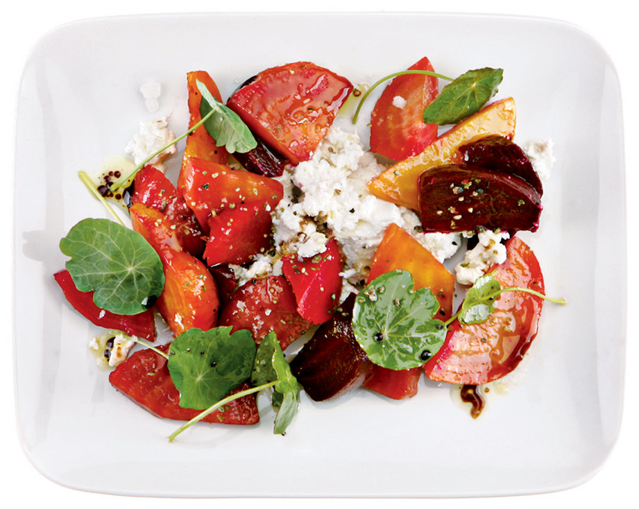 - Scoop the goat cheese into the middle of a large serving platter. Arrange the beets and their dressing on top and around the cheese. Sprinkle with fleur de sel and four-pepper mix to taste. If you choose, garnish with nasturtium leaves.