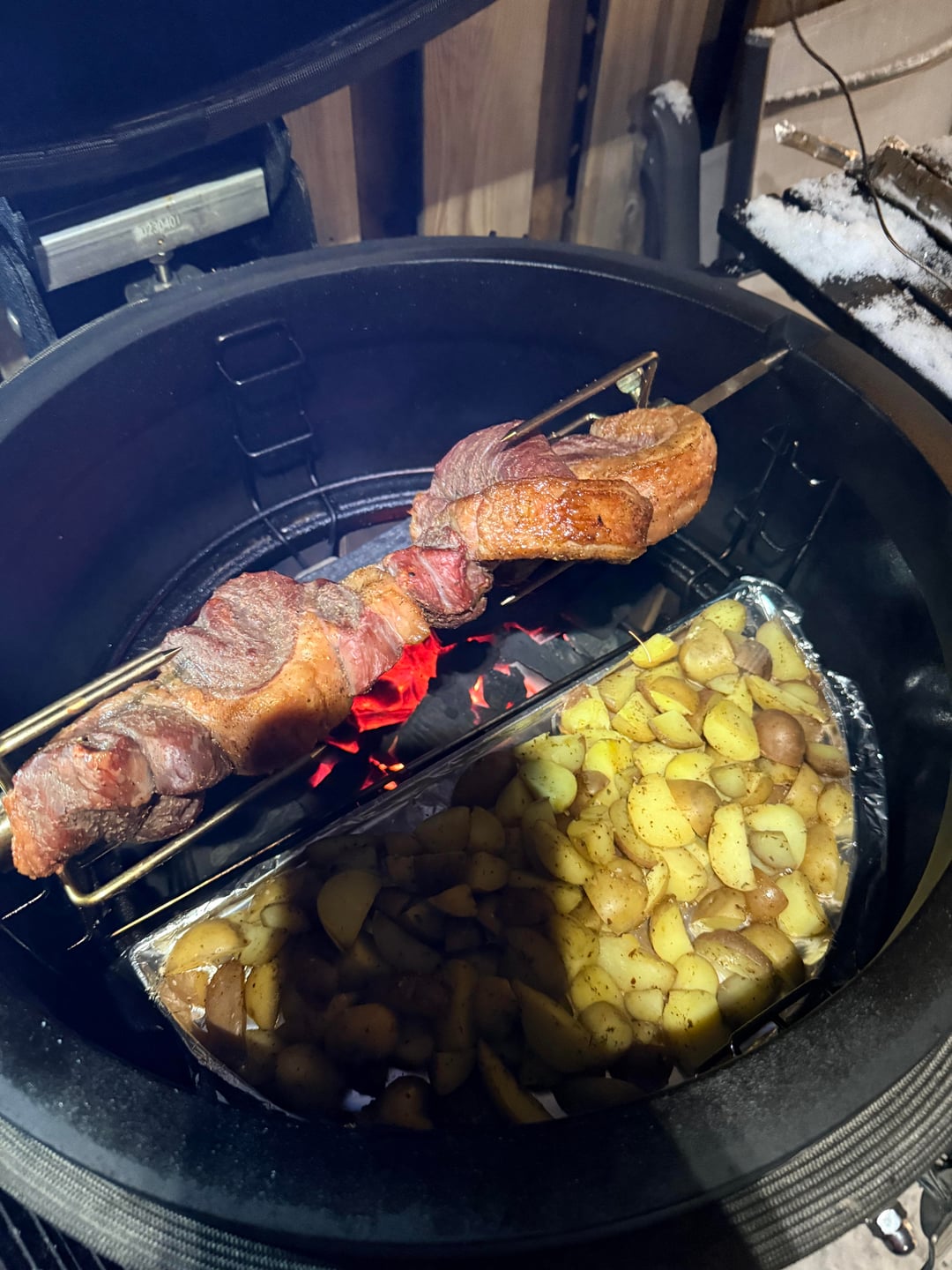 Also did parboiled potatoes halfway through till crispy. They got a bit of the juice from the picanha rotating above.