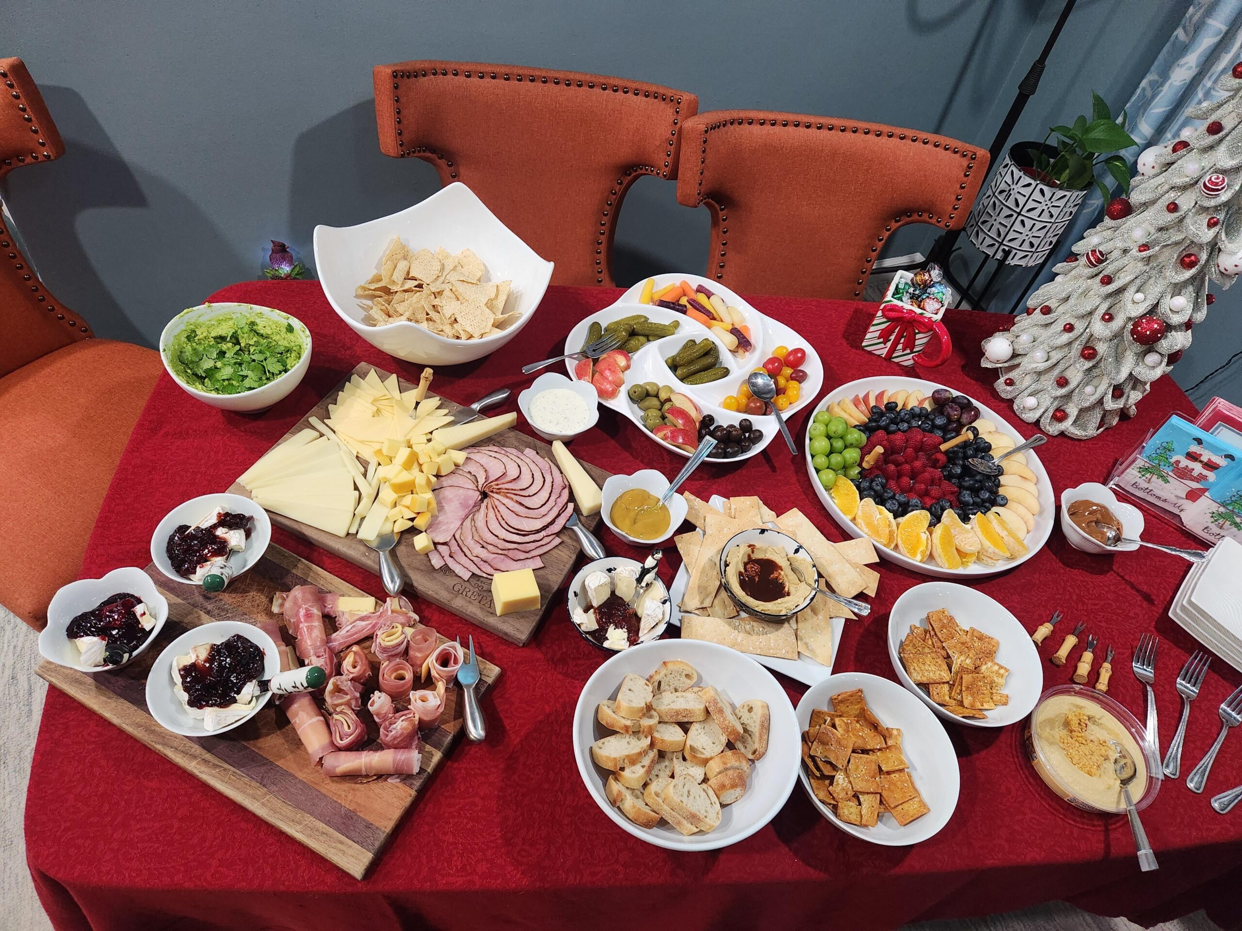 Looks great! I might just scatter any bowls that have identical contents, such as the ones with brie(?) with jam so that they’re more evenly distributed. Overall, great job!