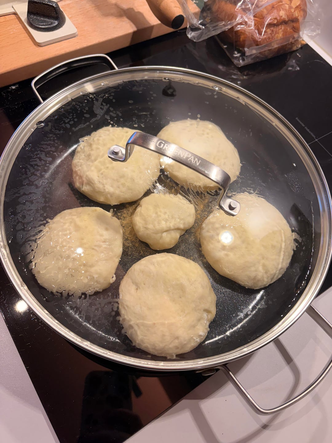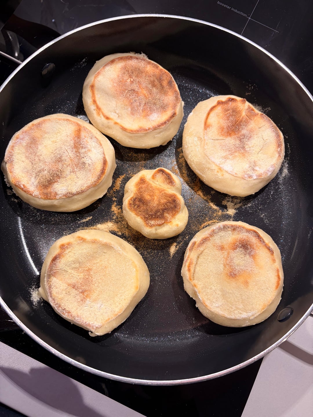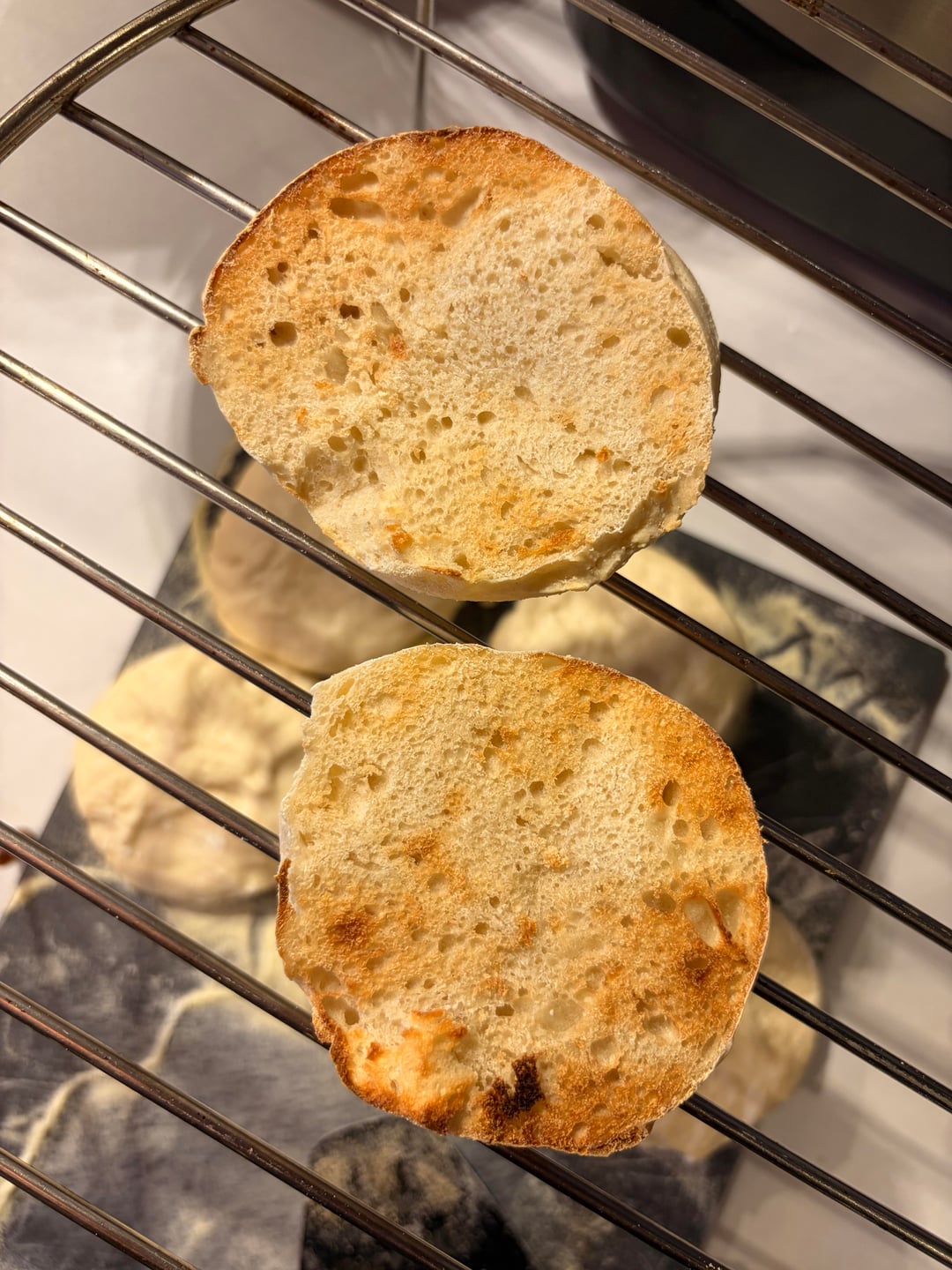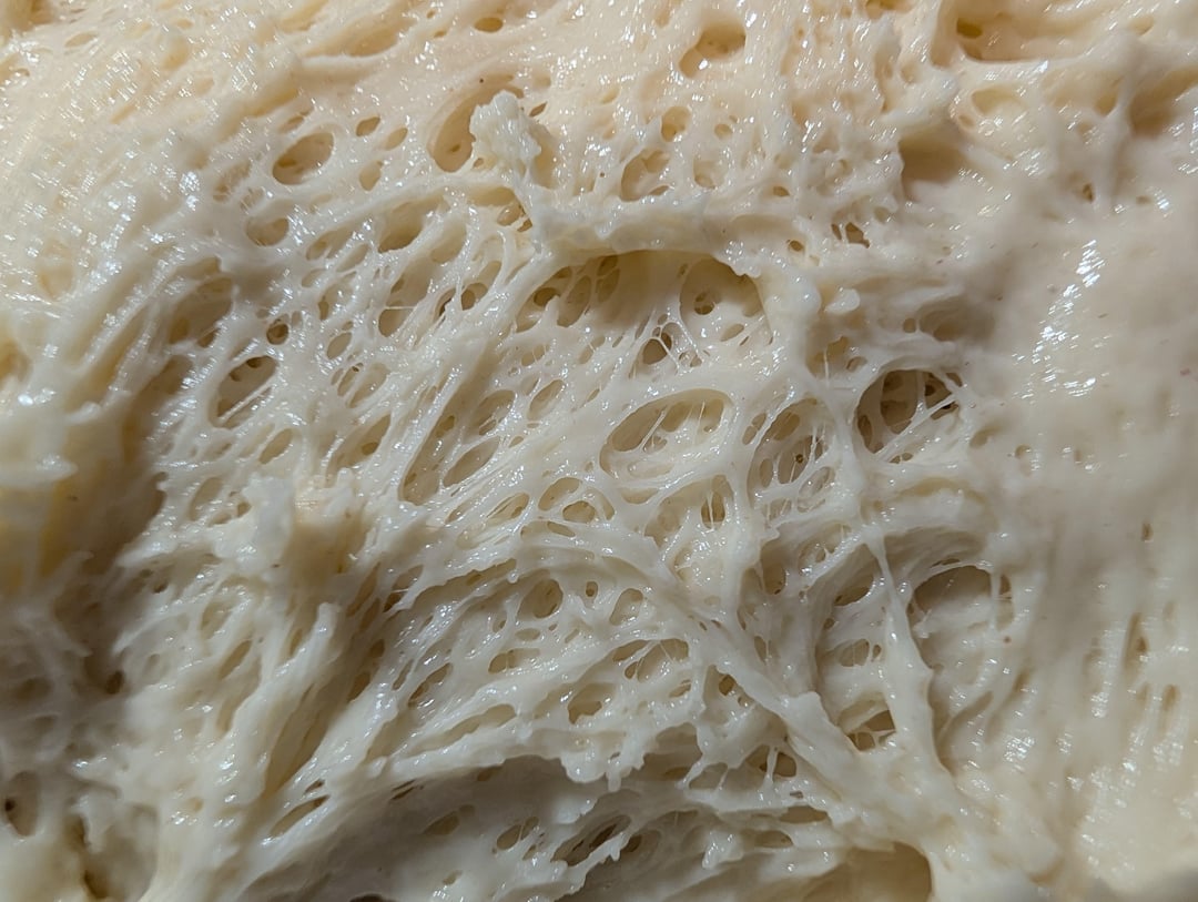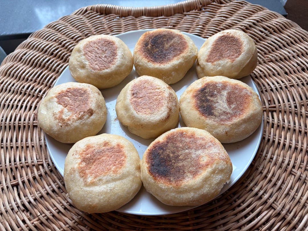 I combine it all together at once, give it a good mix and then two sets of stretch and folds with 25 minutes in between. I let it ferment for about 6-8 hours on my countertop then put it in the fridge for around 12-48 hours depending on when I want to bake. The longer you leave it the nicer the flavor becomes. I then shape them into 10 muffins with a cutter, sprinkle them in semolina and leave them for another hour and then bake them 6 minutes on each side in a frying pan (no oil or butter) on low-medium heat.