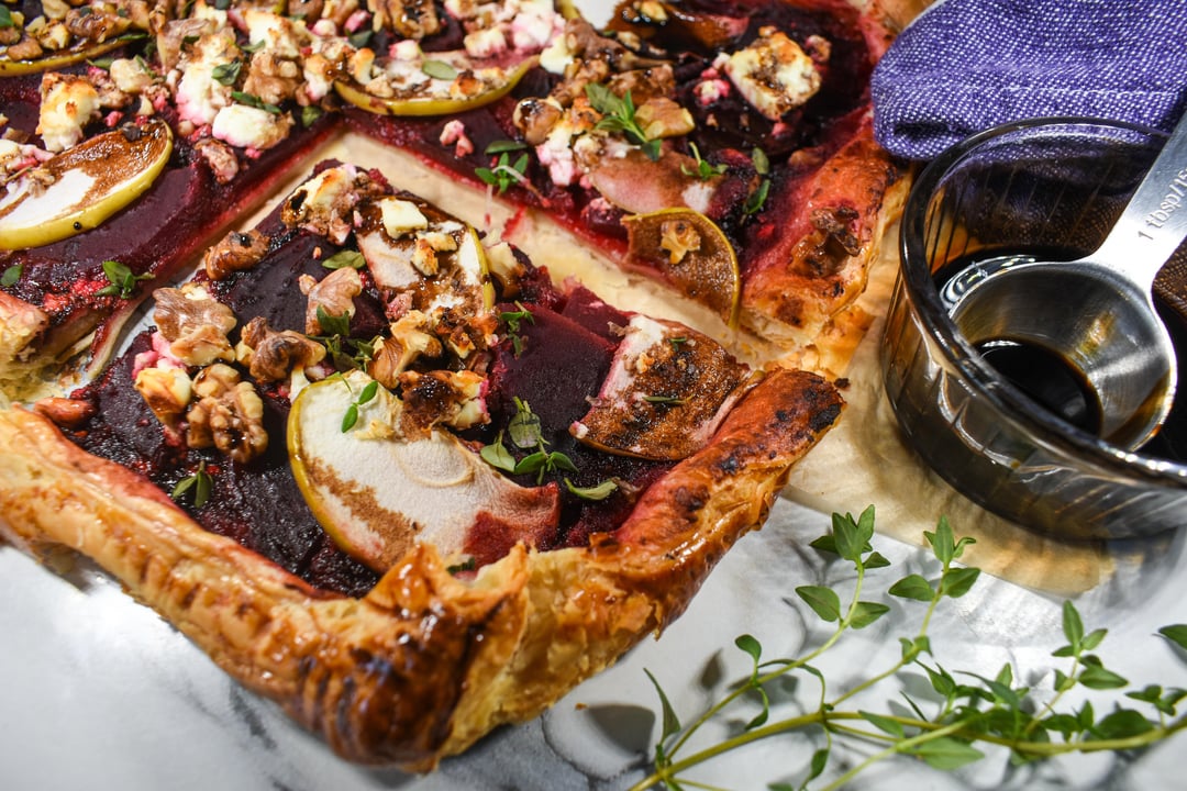 A rustic beetroot tart featuring walnuts, apples, feta cheese, and a homemade beet purée all layered on a flaky puff pastry base and drizzled with honey balsamic glaze.