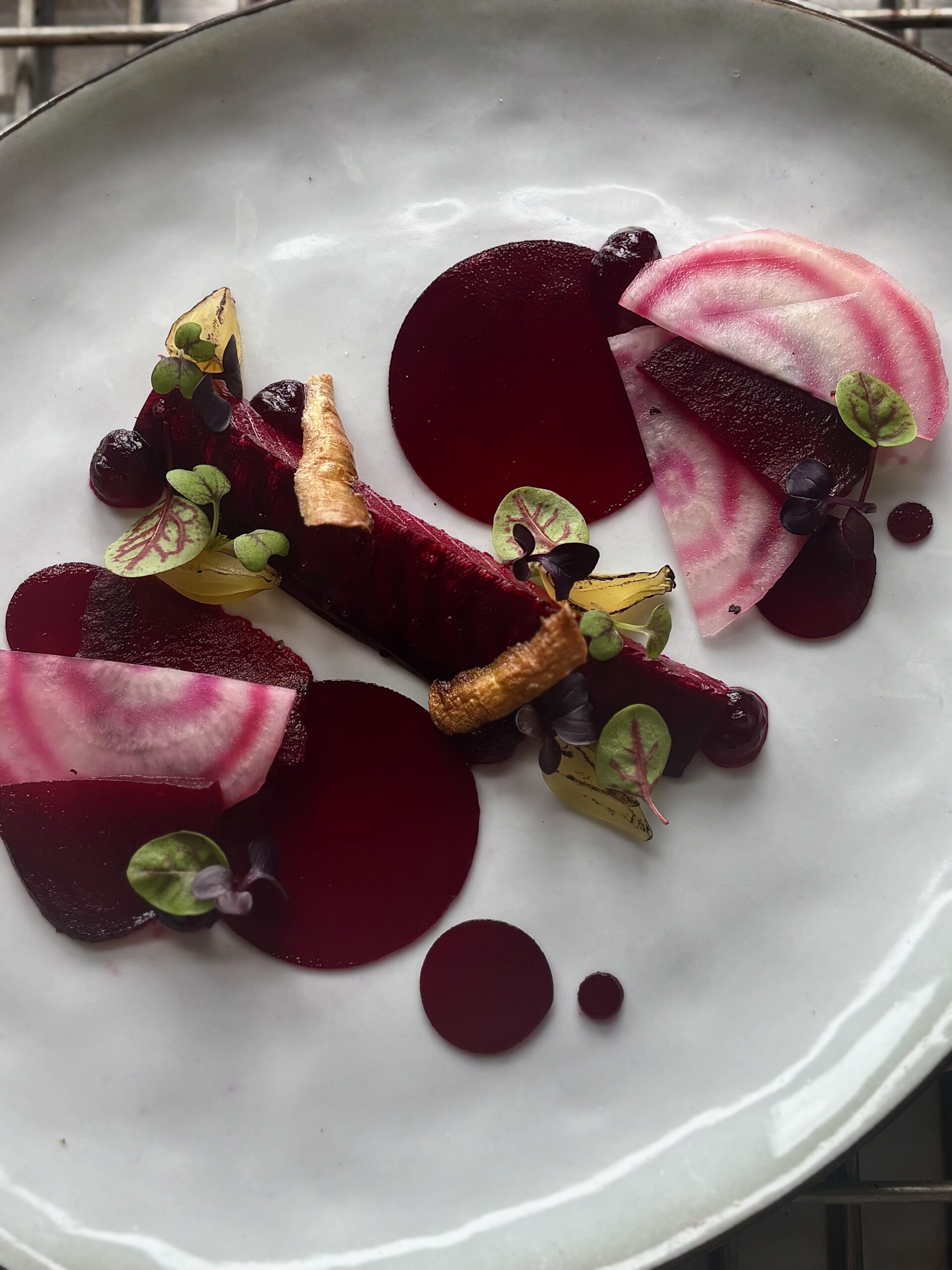 I think it’s beautiful, but also think it would be beautiful (and more obviously a mackerel and beetroot dish) if the mackerel wasn’t dyed beetroot colour. IMO, if you really want to have the mackerel that claret colour, I’d go with only fresh beets that aren’t that colour.