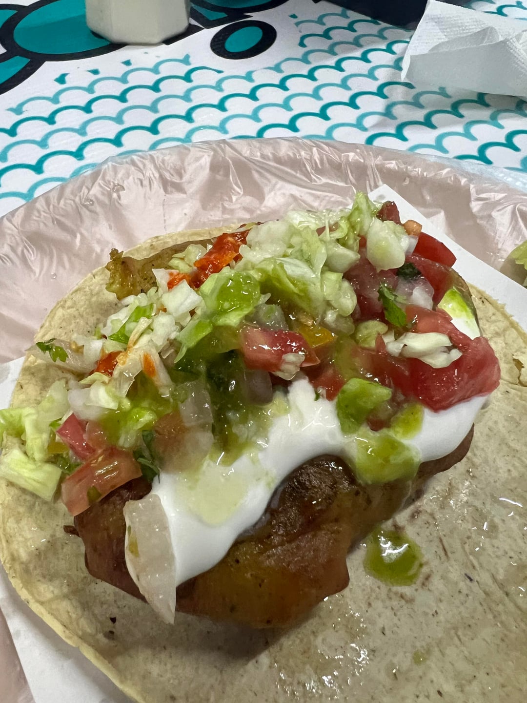 Fish Taco from El Chopipo since 1980 in Ensenada, BC. These are not the originals, but they are my favorite! With pico de gallo, cabbage and red and green salsa by SlowLorisPygmy Dining and Cooking