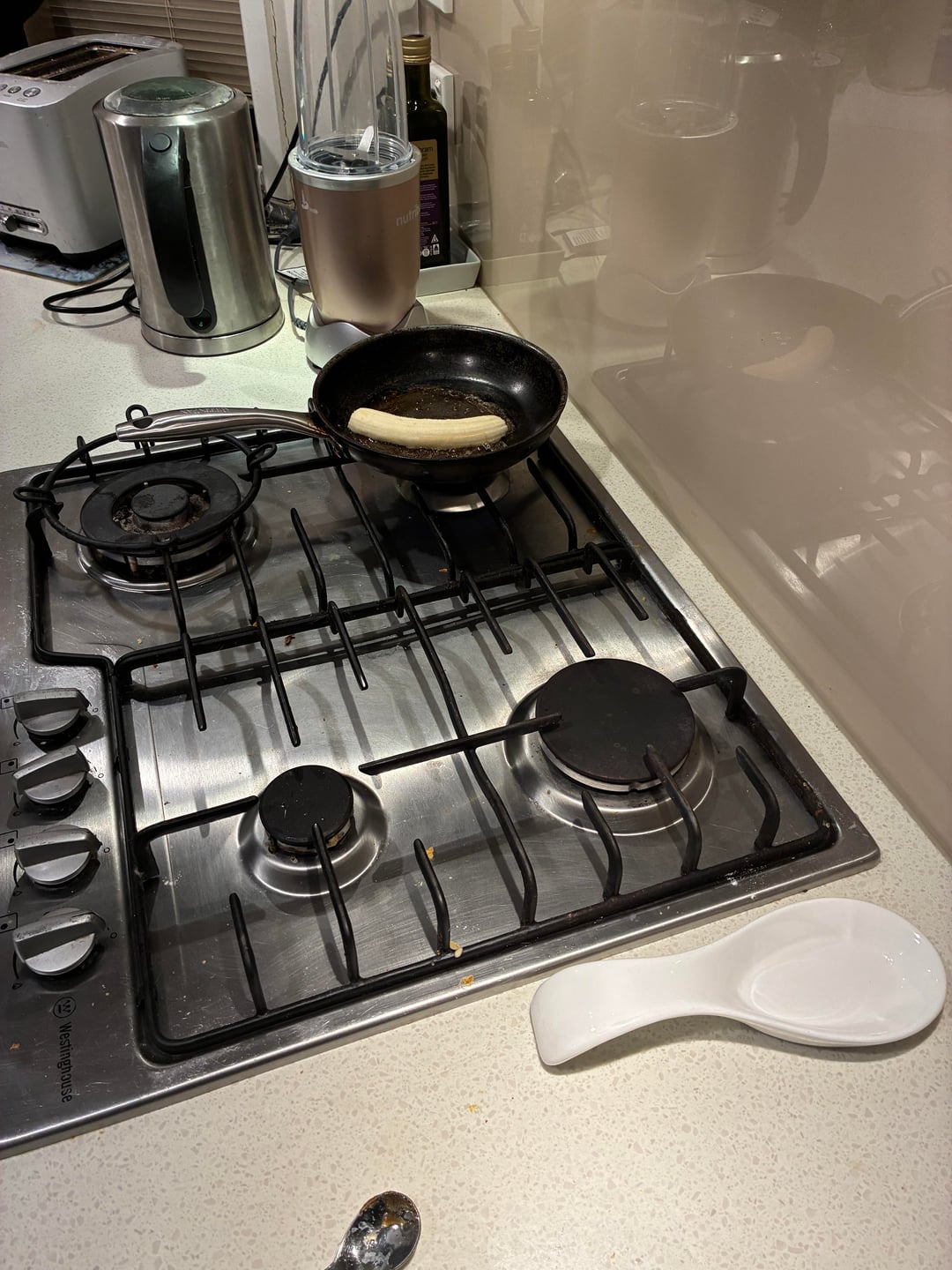 A banana, split down the middle, half caramelised, half not, sprinkles with cinnamon and a drizzle of sugar free maple syrup, on a bed of vanilla protein porridge 10/10⭐️🌟😋 – a former ashamed banana hater.