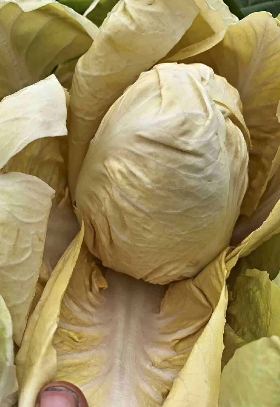 Lane: It is, yes. All pink. There’s one that is all yellow now called ‘Yellowstone’ [above]. Yes. And that one is really cool. I think the less color there is in it, I feel like the more mild it is. And so the yellow one, it’s really small, too. It’s a Verona, so it’s like the same shape as the Verona ones, which is kind of like a little teardrop shape, or sometimes it’s like oval if it doesn’t make the little point. Very cute. And it’s so nice because you can just cut the bottom off and just kind of peel all of the leaves off. And they’re just like the perfect size, and are a little bit like Belgian endive. So you can put it in a salad and use it that way. Or you can use it for hors d’oeuvres or something, where you put something in it and eat it just like you would like Belgian endive or something. A little hand salad [laughter].