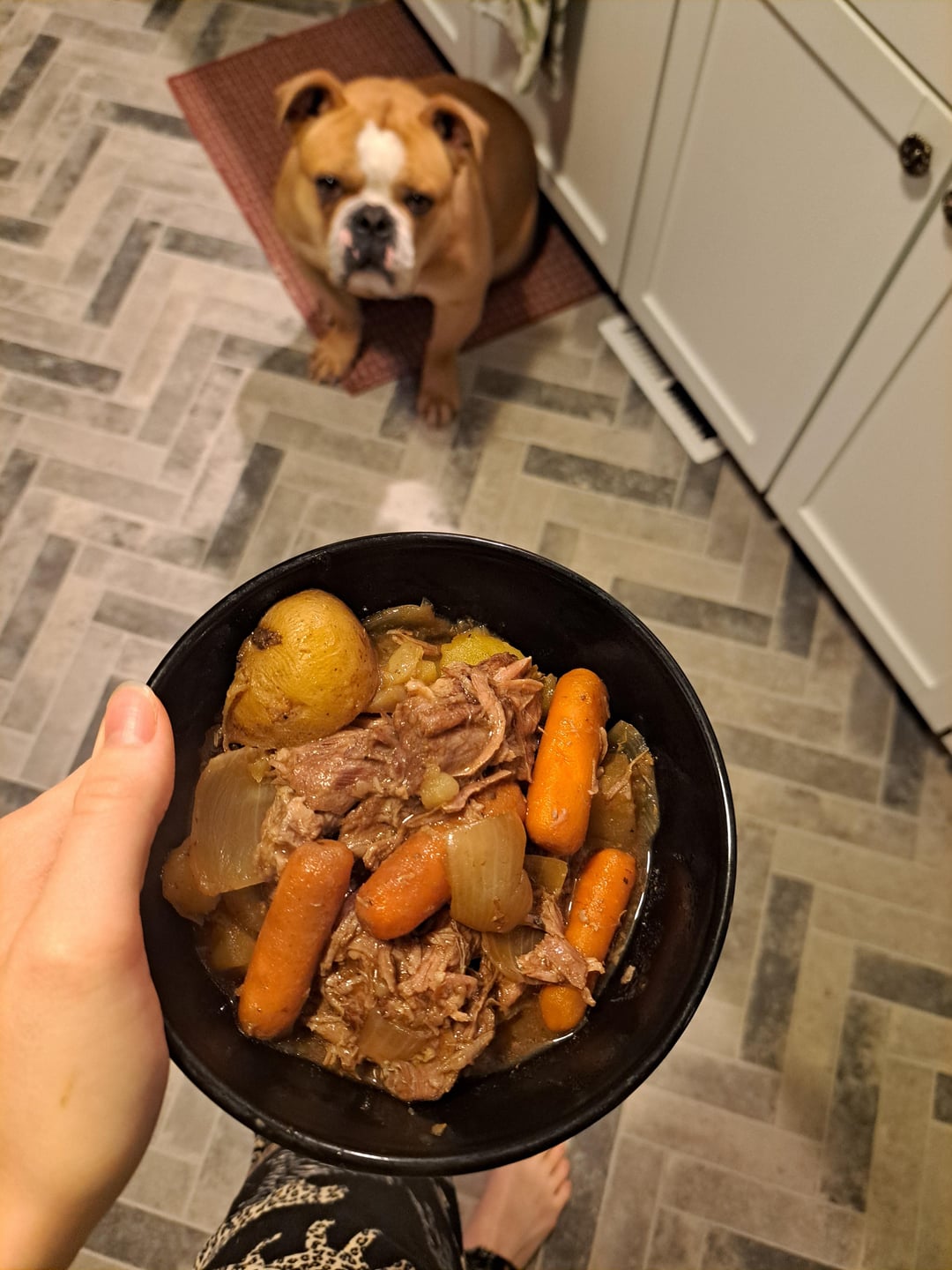 While I’m sure your pot roast was delicious; I’m not a fan of pot roast. I just upvoted and commented because your dog is cute and awesome.