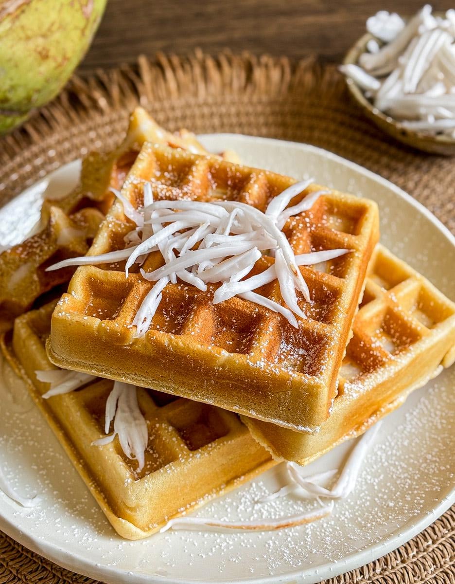 Coconut Wafflesby hungryinThailand 3 Comments hungryinThailand 1 month ago [https://hungryinthailand.com/thai-coconut-waffle-recipe/](https://hungryinthailand.com/thai-coconut-waffle-recipe/)# Ingredients* 2 cup **all-purpose flour** * 2 tsp **baking powder** * 2 **eggs** * ½ cup **sugar** * ½ tsp **salt** * 1½ cup **fresh whole milk** * ½ cup **oil** * 1 tsp **vanilla extract** * **young coconut meat**, shredded, add to taste * **sesame seeds**, optional, to taste# Instructions# Make the batter1. In a large bowl, mix the flour and baking powder until evenly combined.2. In a separate large mixing bowl, whisk the eggs, sugar, salt, milk, vanilla extract, and oil until smooth.3. Gradually whisk the wet ingredients into the dry ingredients just until smooth.4. Let the batter rest for 5-10 minutes, allowing it to thicken slightly.# Cook the waffles1. Preheat and lightly grease the waffle iron. Pour in enough batter to cover the base.2. Scatter the young coconut meat and sesame seeds (if using) over the batter.3. Spoon a little more batter on top, close the waffle iron, and cook until set and lightly golden.4. Remove the waffles and let them rest on a wire rack for a few minutes before serving. Don’t stack. Enjoy! ChineseAndrey 1 month ago It immediately brings back childhood memories. But the coconut snaps me right back to reality 😄🥥 Whiterabbit2000 1 month ago Wow they sound amazing! Will have to try and make a vegan version of this, well done OP