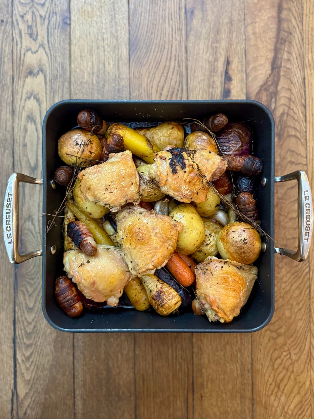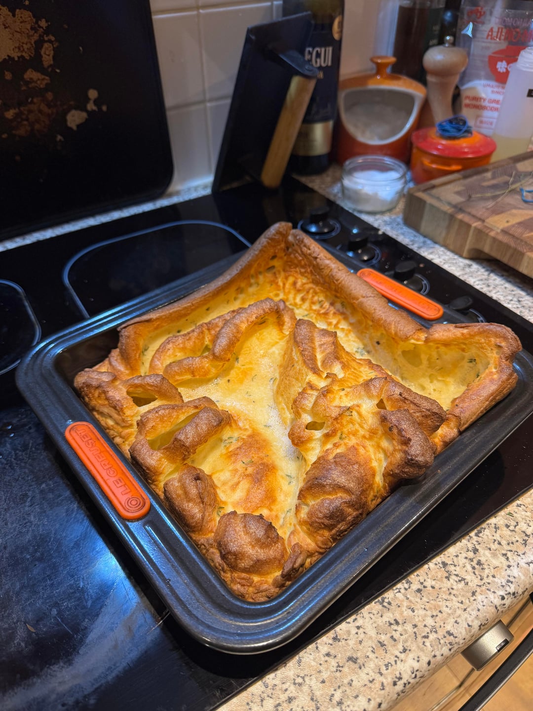 Fancied a roast; didn’t fancy the effort. Threw a load of root vegetables into a roaster with chicken thighs and pigs in blankets and plenty of honey and mustard and oil. Made a giant Yorkshire pud, too. I wish I’d gone to the effort of making a gravy—the pan juices were good enough, but only just.