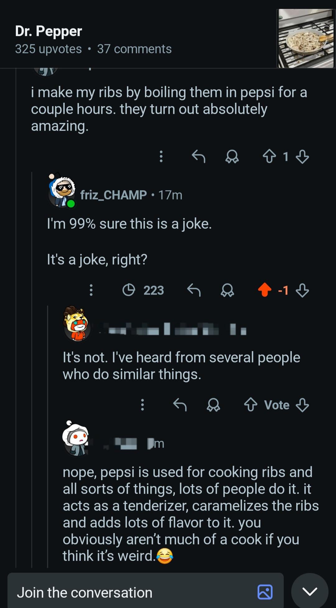 I’ve made a Pepsi marinade with soy sauce, garlic, brown sugar, etc before and it slaps. Crazy as good ribeyes … Soda can be interesting with meat…