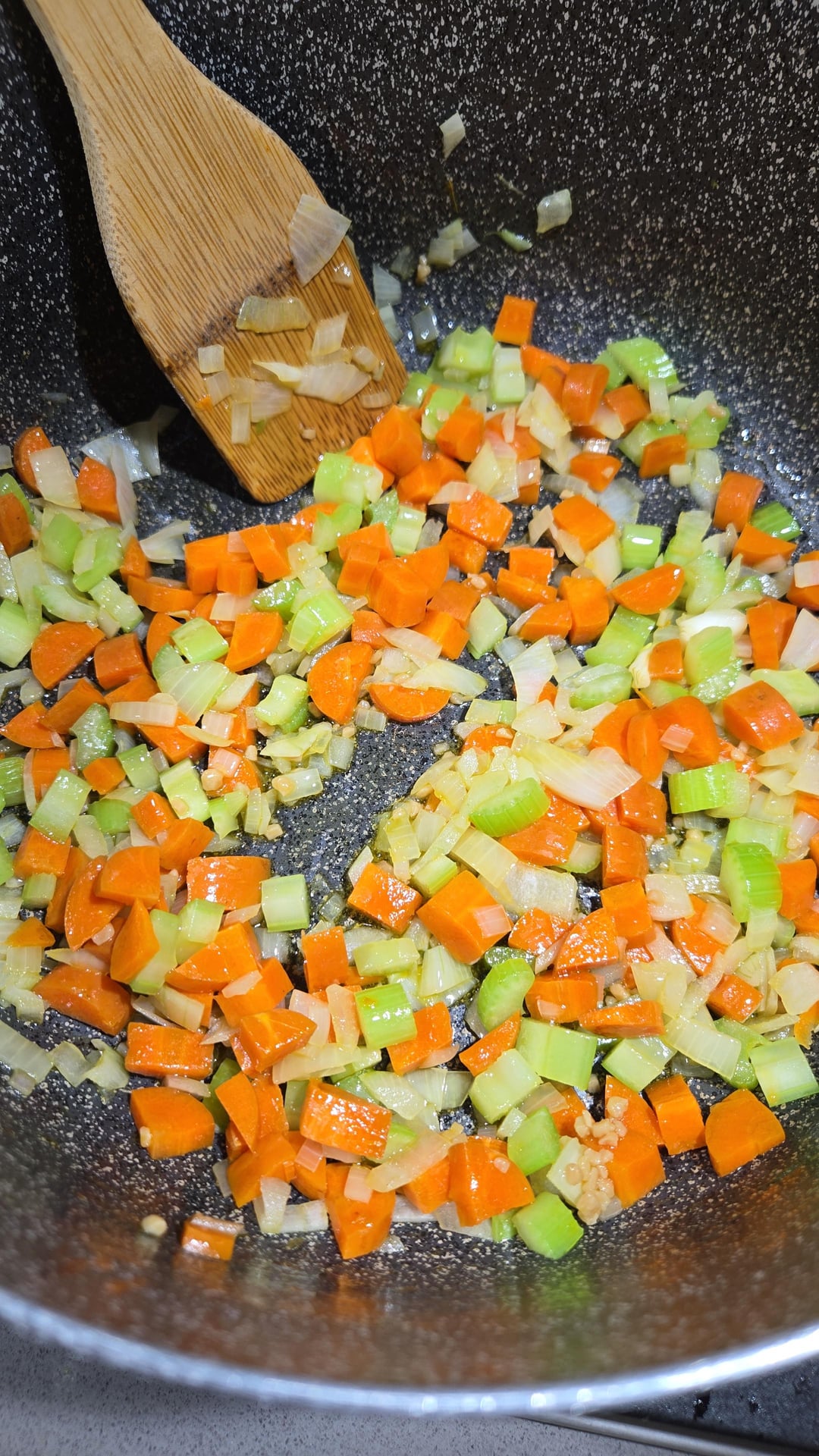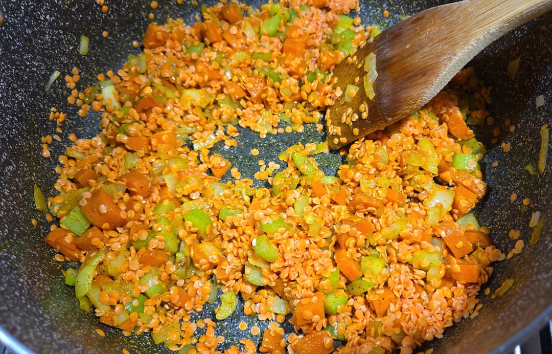 Dice carrot, celery, onion and garlic (not pictured). Sautee first 3 in pan with olive oil, once soft add garlic and Sautee. Add in ground spices and Sautee, add in lentils (rinsed well) and broth of choice. Season with salt to taste.