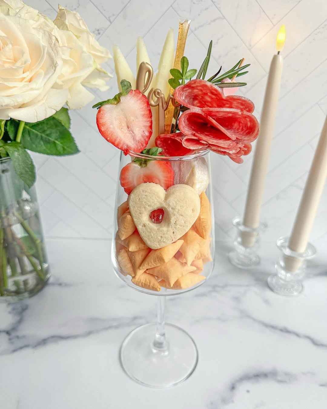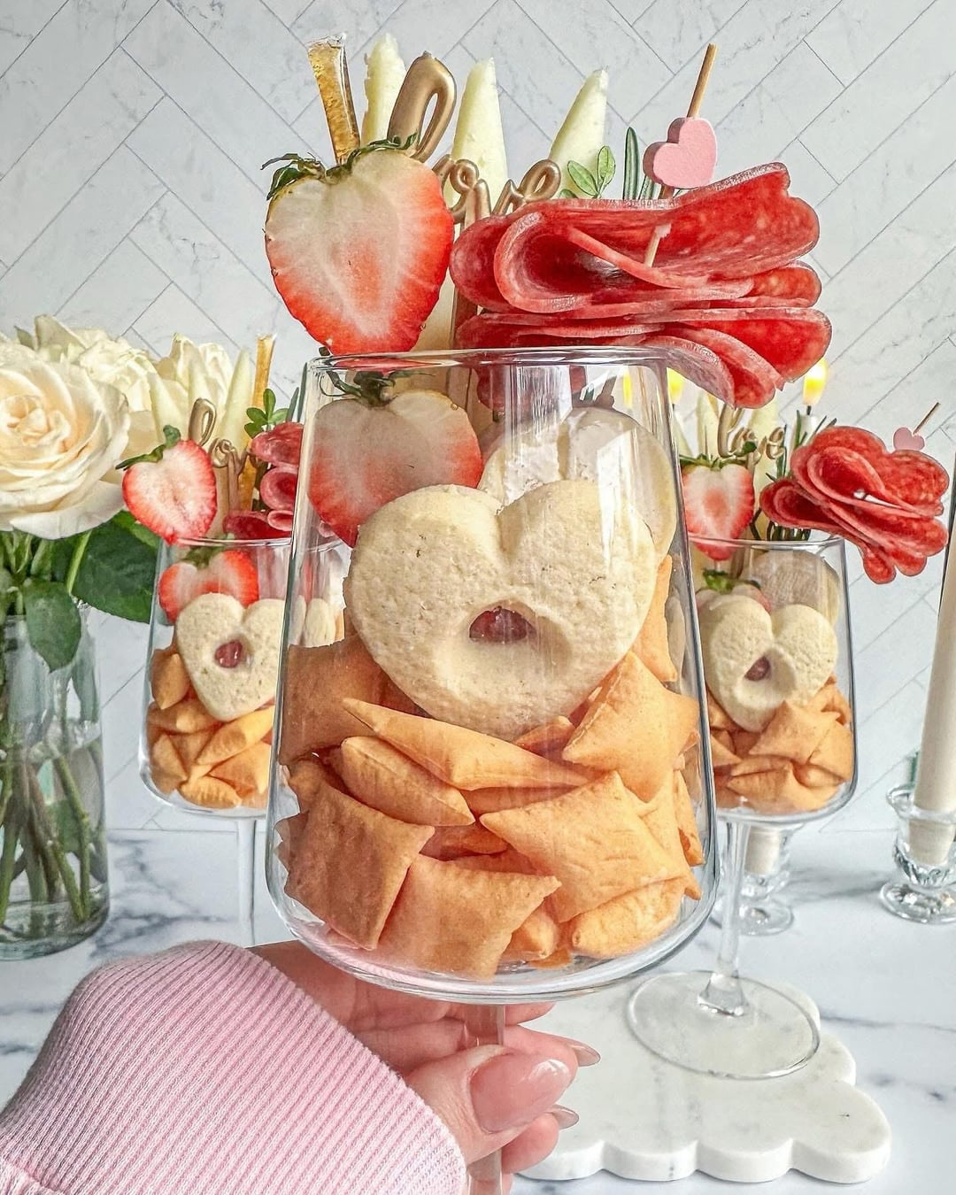 Valentine’s/Galentine’s Day Inspo 🩷🧀crackers, mini brie bite& a cookie at the bottom, strawberry skewers, salami skewers, manchego and honey stick. Cute way to display. Have plates on the side so your guests can deconstruct and pour out for easy eating 💜