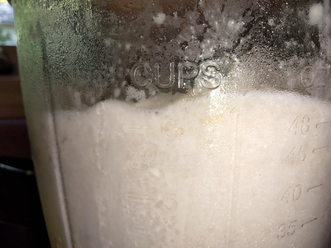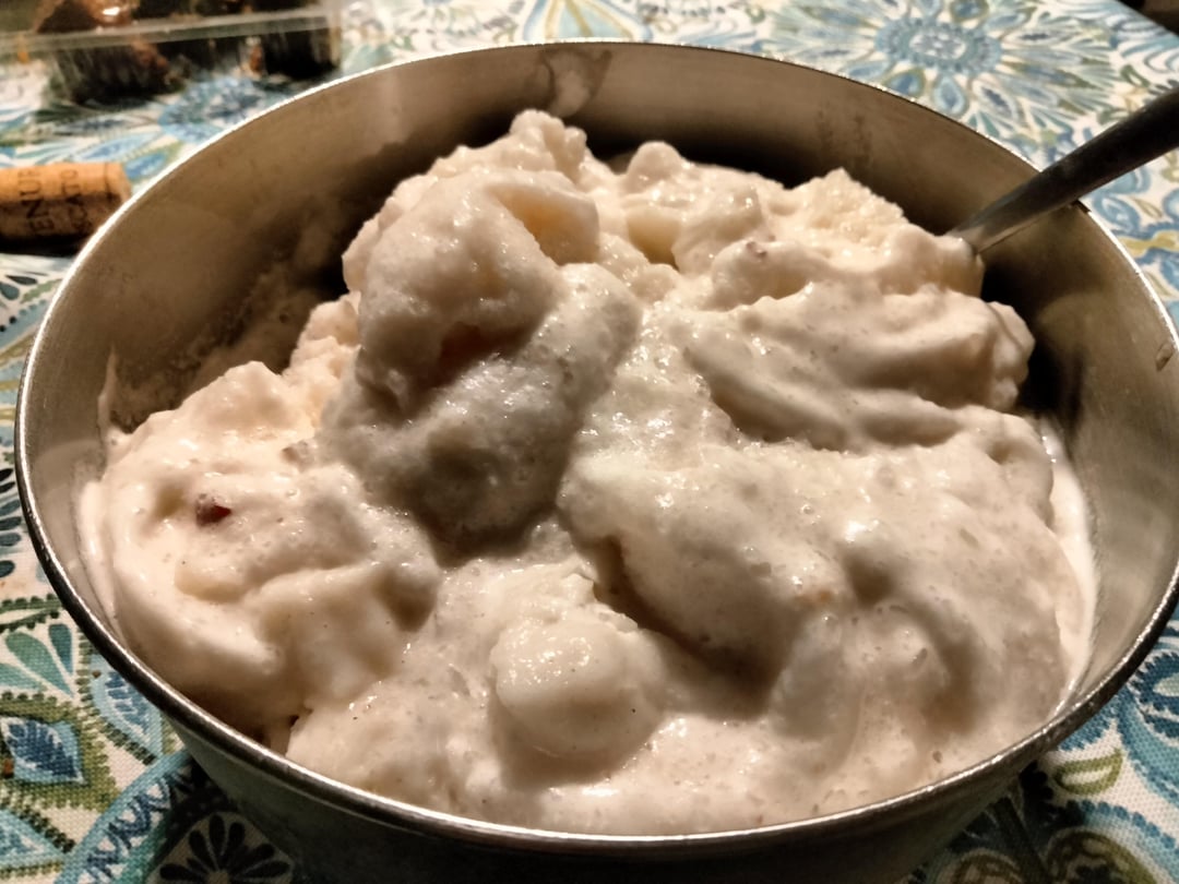 I mixed this into about 22 crushed ice cubes, which was probably made with around 2 3/4 cups water. Once everything got blending together nicely, it started lightening up even more, and when I was done, after taking out the blade pillar and roughly smoothing the top, the fluff came above the 6 cups line! It has barely over 60 calories as is, almost all from protein, and I added some chopped frozen apple and fluffed Greek yogurt mousse (still honing in on getting that recipe quite right). I need to start trying to make smaller batches…