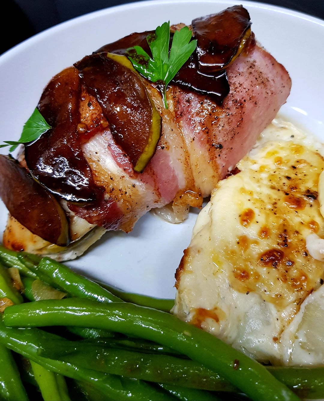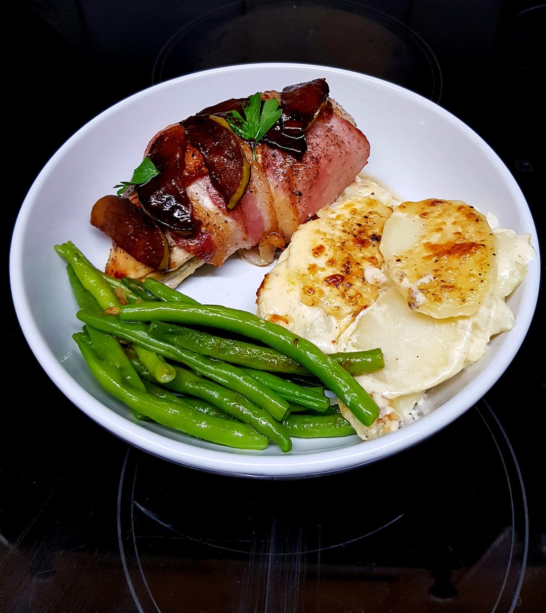 Apple and Cheese Stuffed Chicken, Wrapped in Bacon and Topped with Caramelised Apples, Potato Gratin and Garlic Butter Green Beans. by pink_flamingo2003 Dining and Cooking