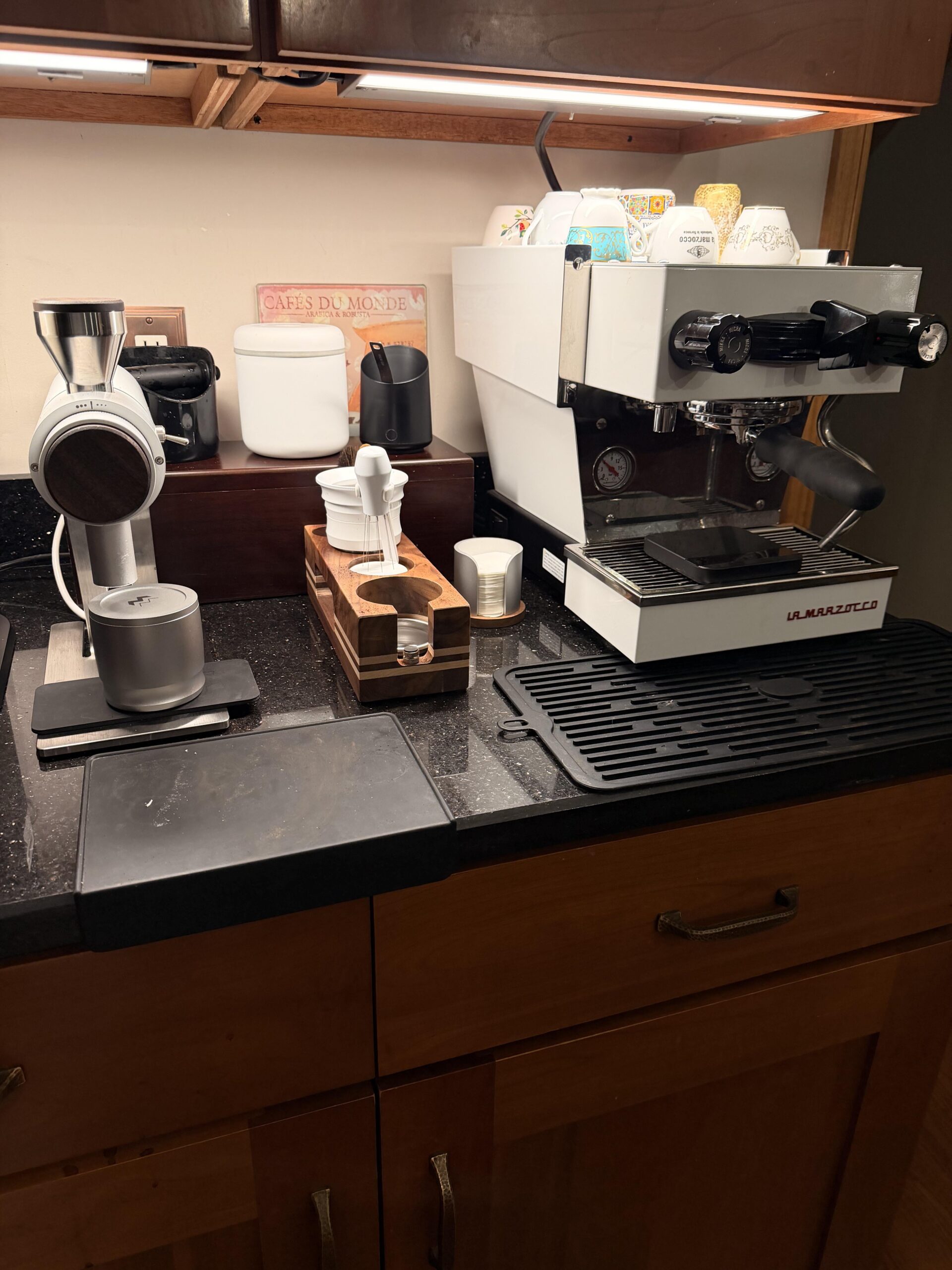 I have had this setup for a few months now. I can safely say that La Marzocco was the best decision for my home. I have seen a lot of posts lately asking whether to go with Mini or Micra. Honestly, if you have the space and budget, definitely Mini (reasons: BBW, timer, ability to pull multiple milk shots in a row when hosting). I have low cabinet clearance and Mini would be too big. Micra’s build quality is great, it can easily pull 6-8 espresso shots in succession without quality drop (I’ve tried that when making multiple espresso martinis lol) and, well, it looks beautiful. If you love light roasts though I would not even think of it unless you can easily plumb in for pre-infusion. Even then I’d pick something with flow control. I will definitely plumb-in if at one point I decide to renovate the kitchen but I love my medium and dark roasts, and the machine does beautiful with those. Who knows, maybe I’ll master lighter roasts eventually too on it but I suspect it would be easier to dial those in with flow control and pre-infusion.