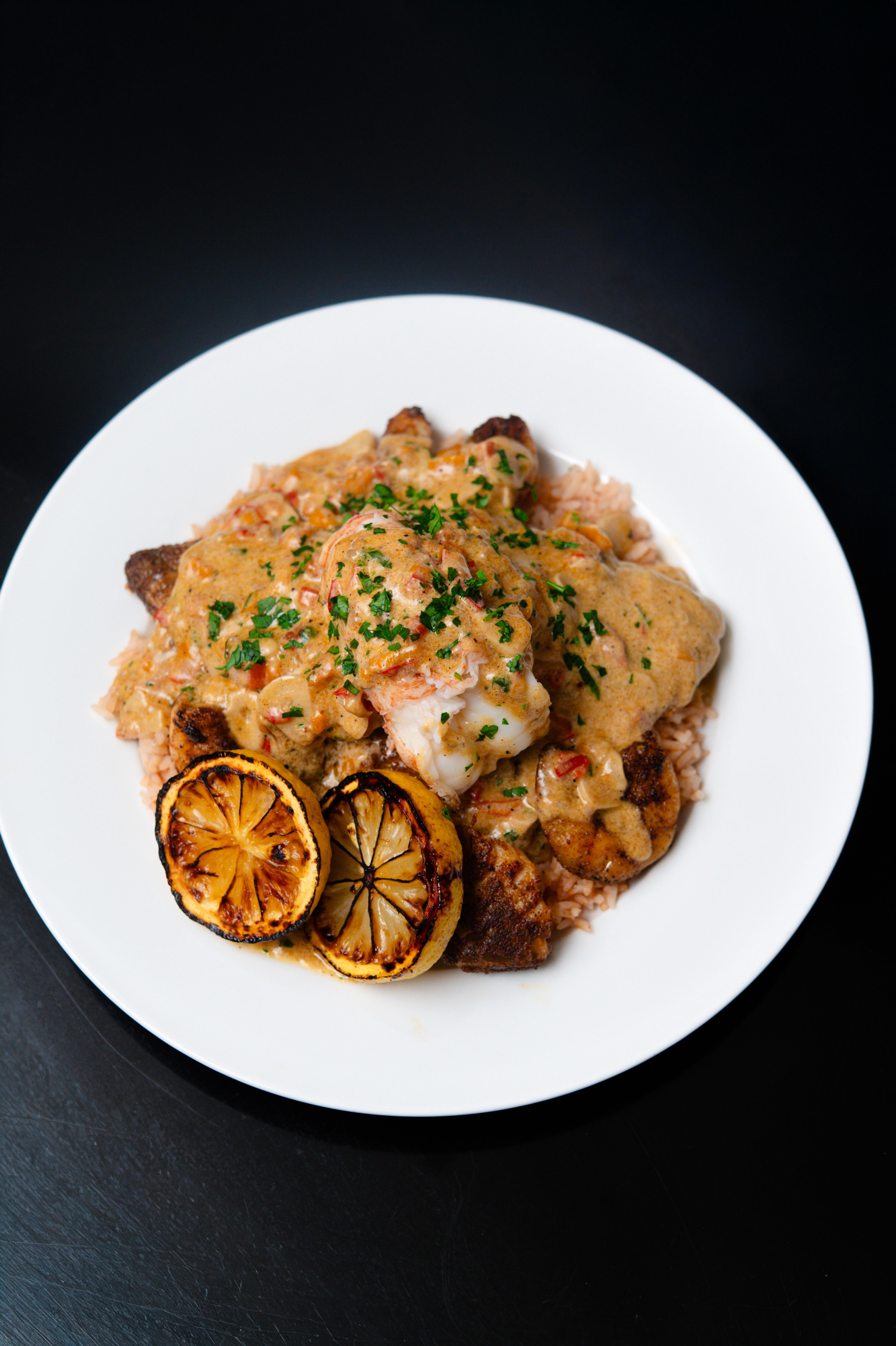 [homemade] blackened red snapper, shrimp and lobster with cream sauce.