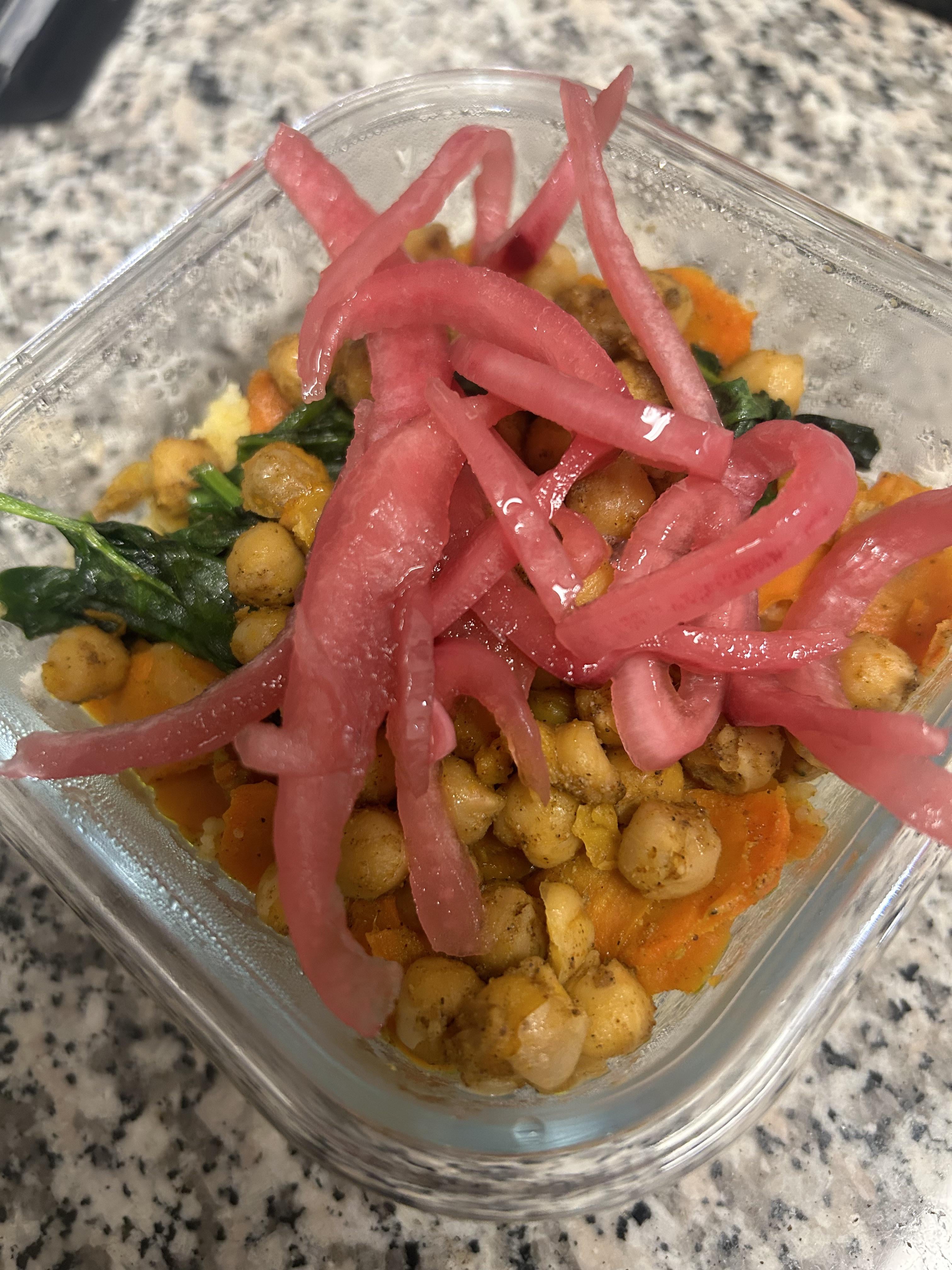 First time pickling onions 🧅✨ Parmesan couscous, garlic-sautéed carrots & onions, spinach, Cajun roasted chickpeas, topped with my homemade pickled red onions.