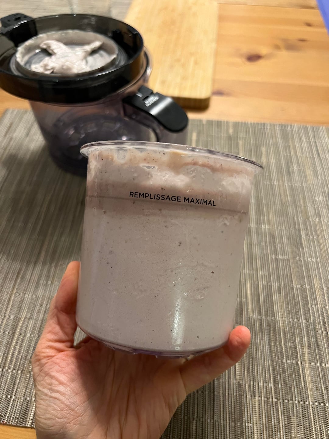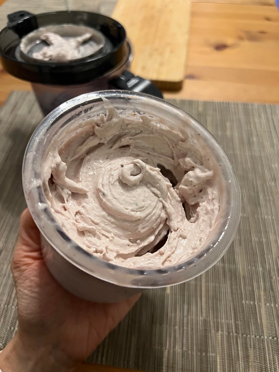 – 70g frozen fruit, some banana works best, this was half banana half strawberry – 30g cottage cheese – 60g almond milk – 60g nonfat milk, ultra filtered if possible – 15g whey protein, this was vanilla – 4g sugar-free pudding mix, this was vanilla – (optional but adds to the creaminess) 5g collagen – 1/8 tsp guar or xanthan gum – pinch salt – (optional but adds to the creaminess) 1 tbsp powder such as 5g freeze dried strawberry powder, cocoa powder, peanut powder, instant coffee powder, matcha etc
