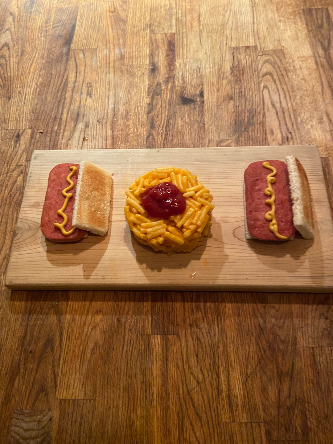 I have never seen a ring mold used to present Kraft Mac n cheese lol. Also is that cutting board on the floor?