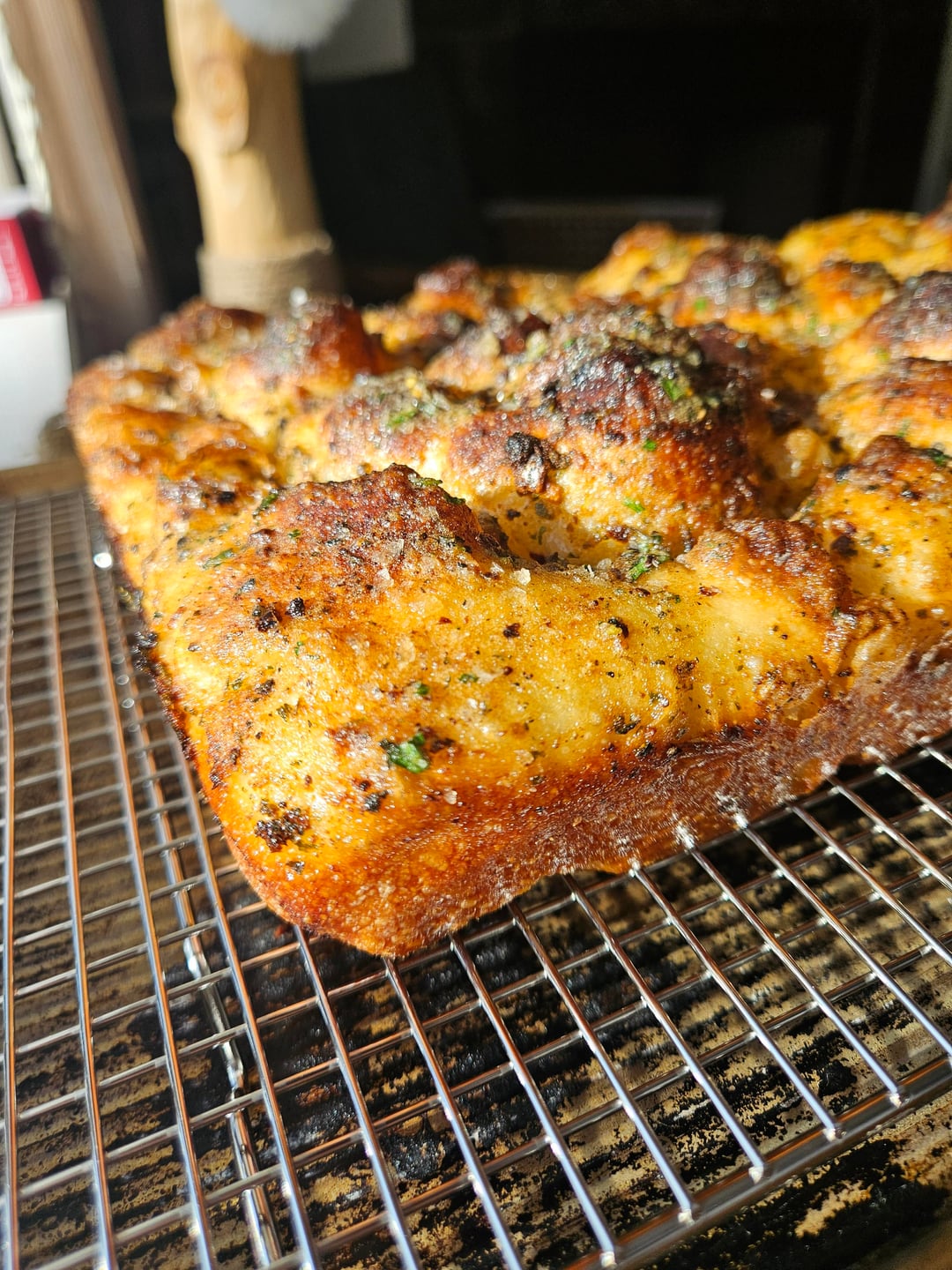 Bake for 25 minutes until golden brown. Take the focaccia out of the pan and let cool on a wire rack, so the bottom doesn’t steam itself in the pan.