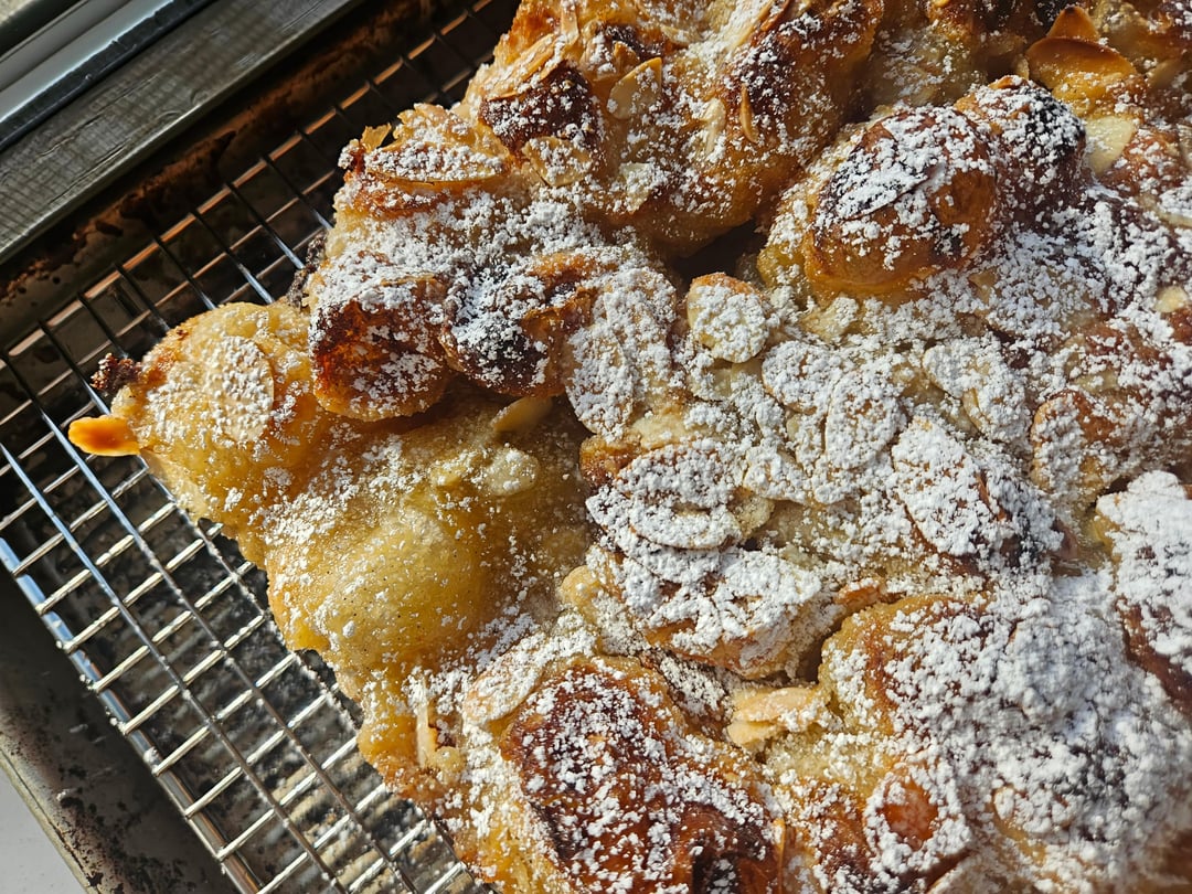 Almond simple syrup – 1/2 cup each water and sugar in a saucepan on medium high, heat until sugar is dissolved. Add ½ tsp almond extract. Brush over focaccia when it comes out of the oven.