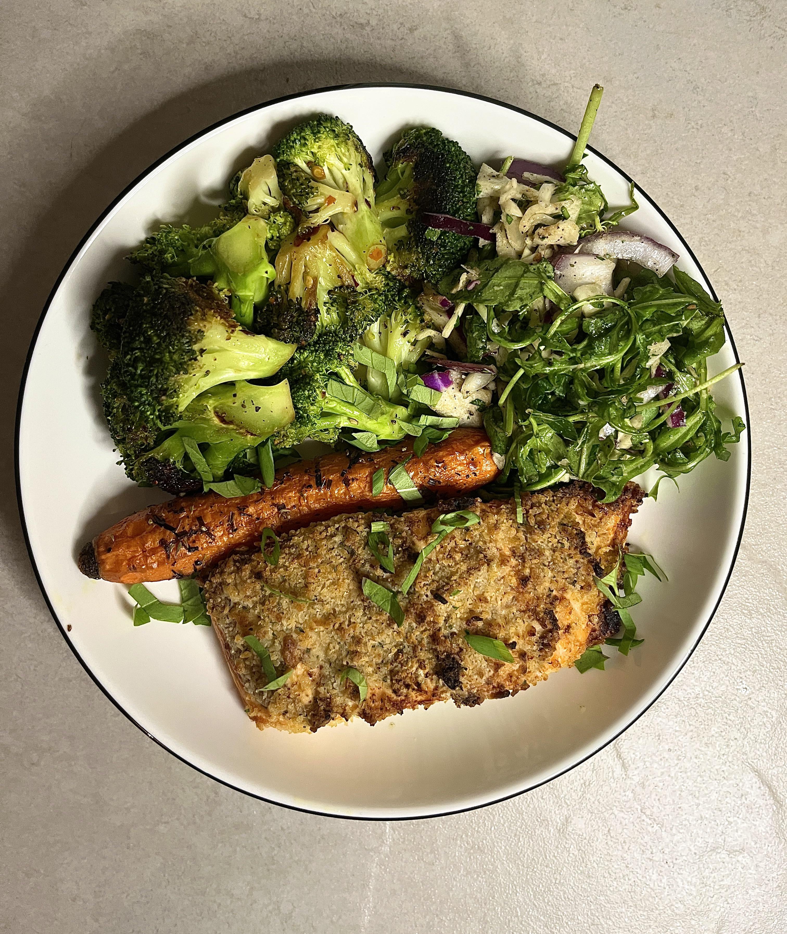 Dijon Panko Crusted Salmon, Charred Broccoli, cabbage Arugula Salad, Baked Carrot