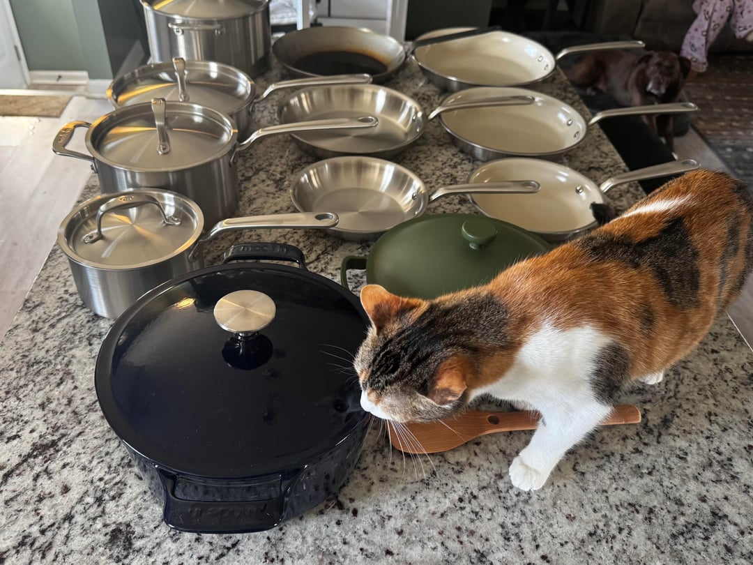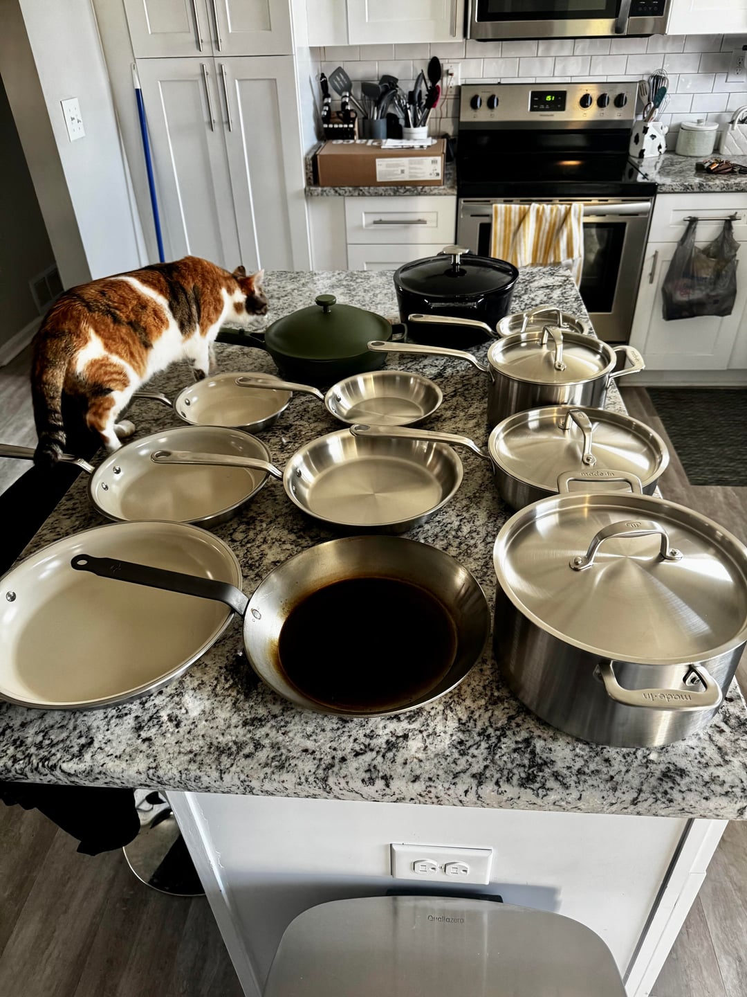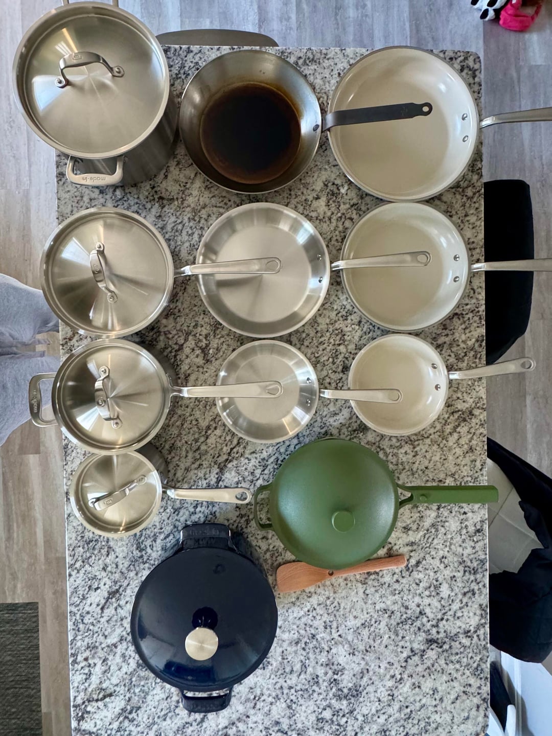 After doing tons of research I made a list of a 5 piece Made-In set, a Matfer carbon steel pan (don’t roast the seasoning pls), and ONE Made-In ceramic enamel coated stainless pan so my girlfriend wouldn’t feel afraid of cooking with the other pans.