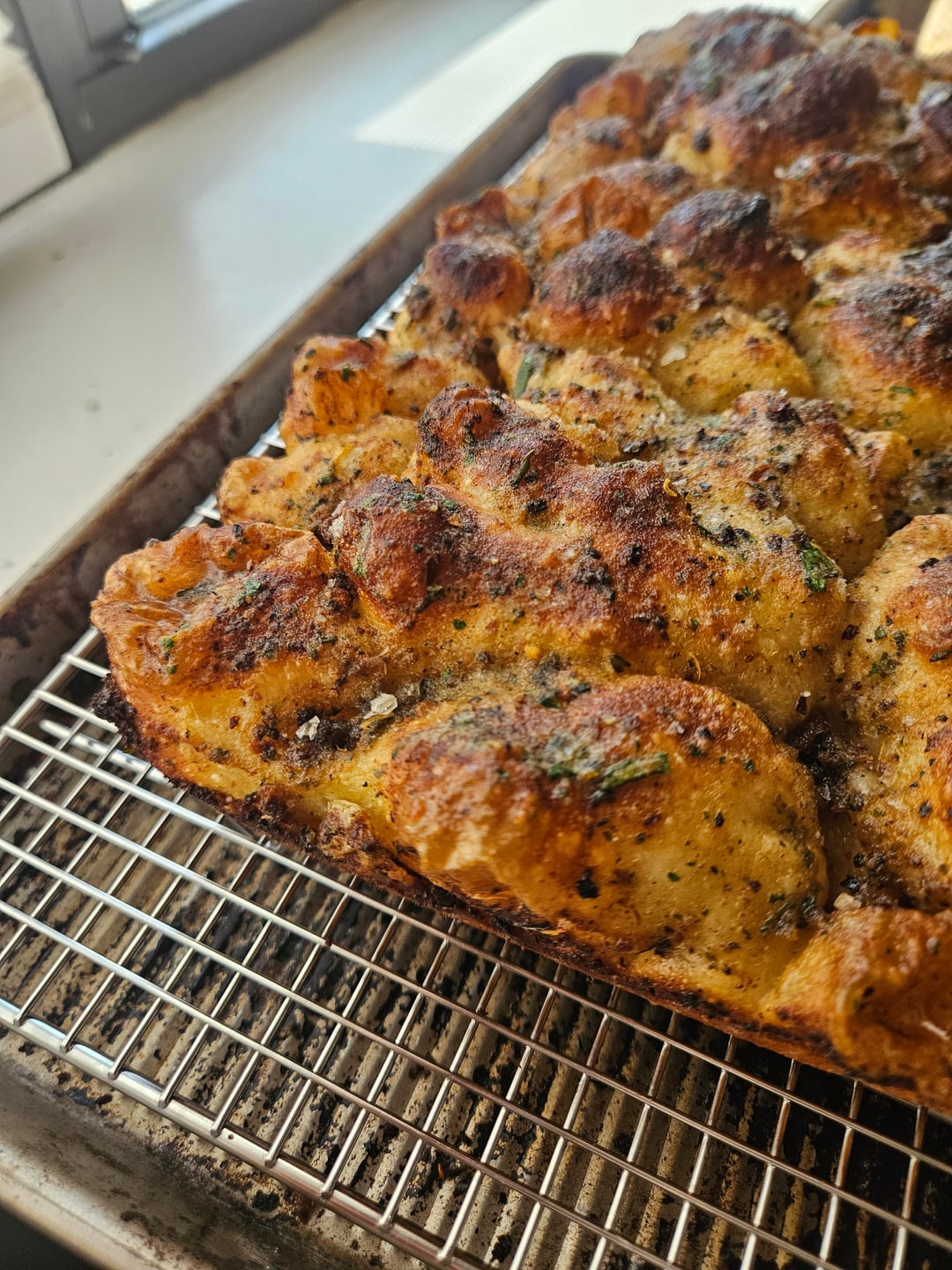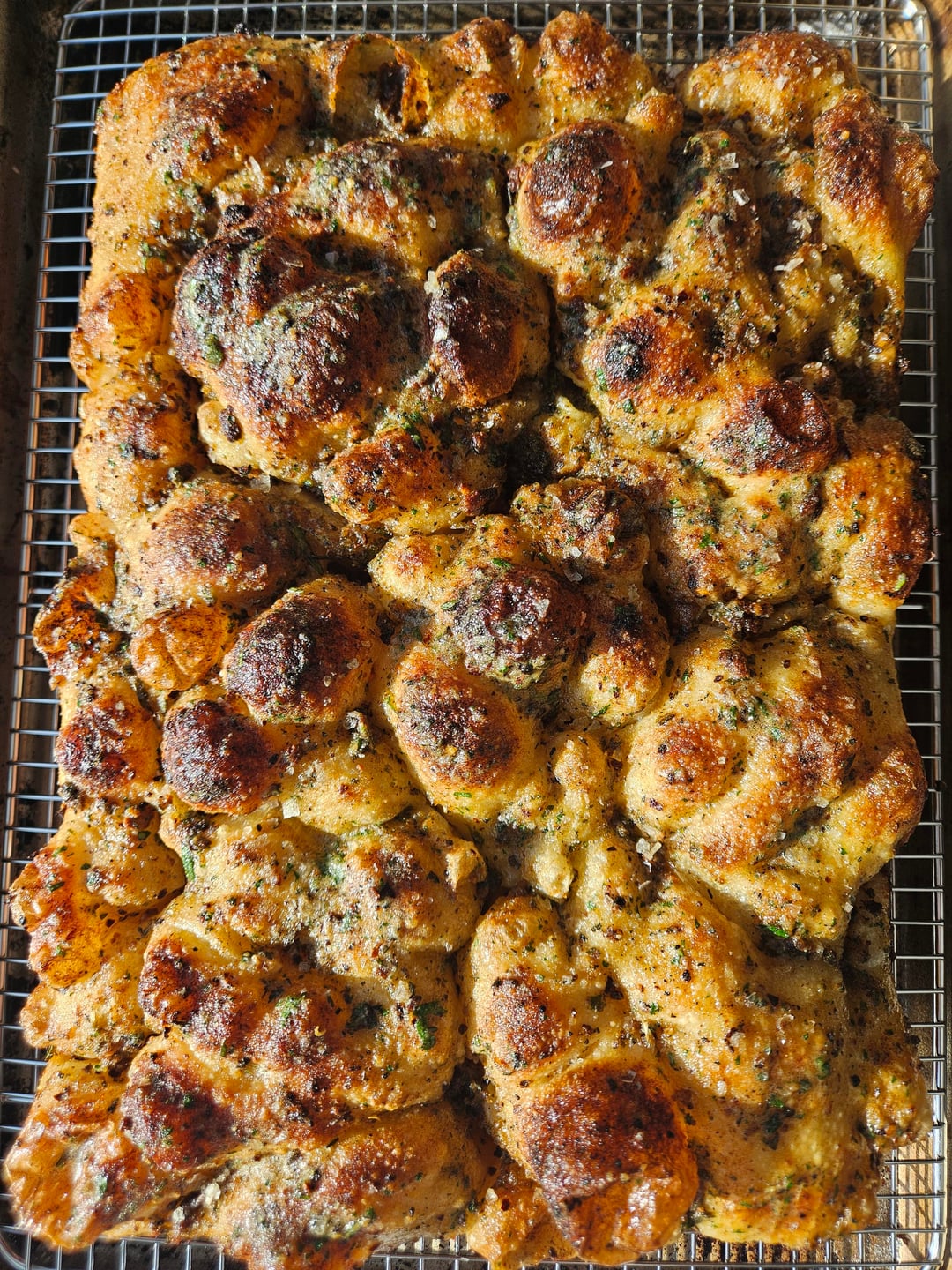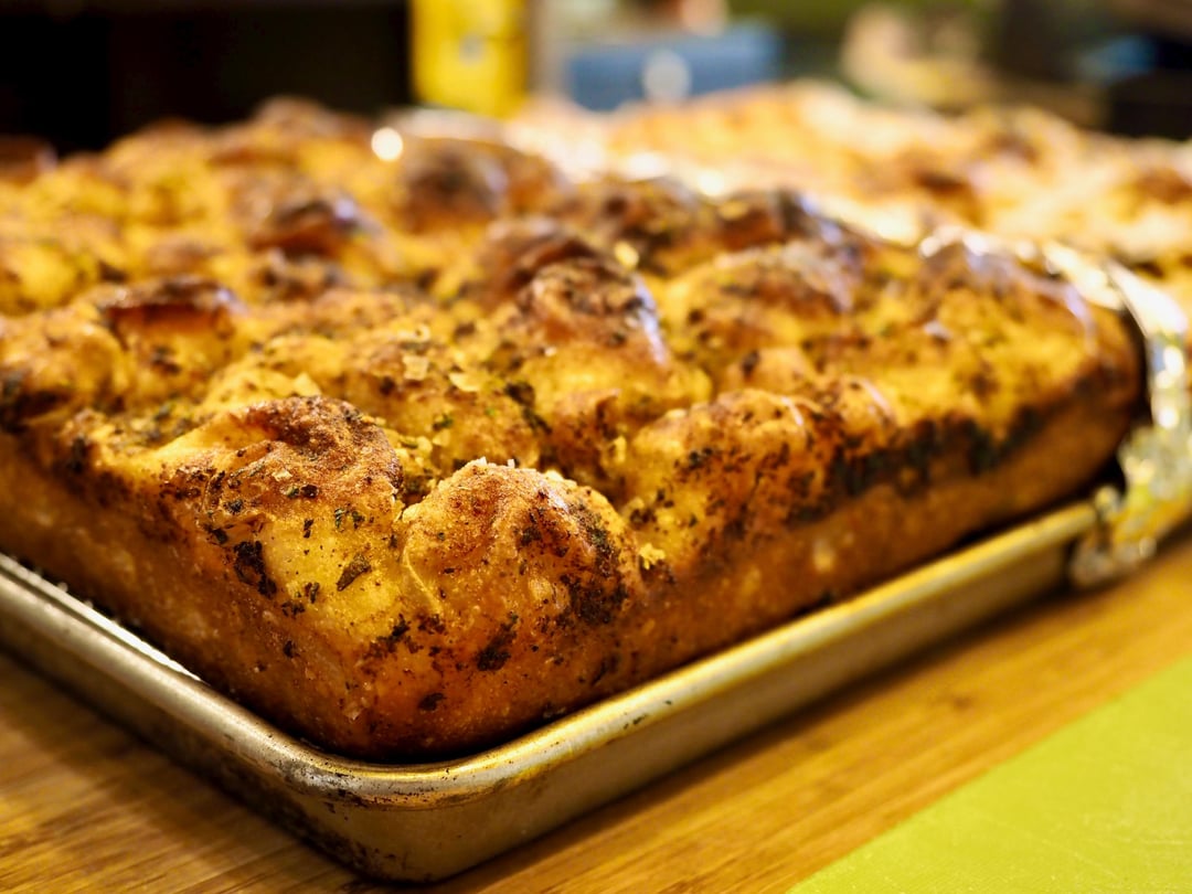 Bake for 25 minutes until golden brown. Take the focaccia out of the pan and let cool on a wire rack, so the bottom doesn’t steam itself in the pan.