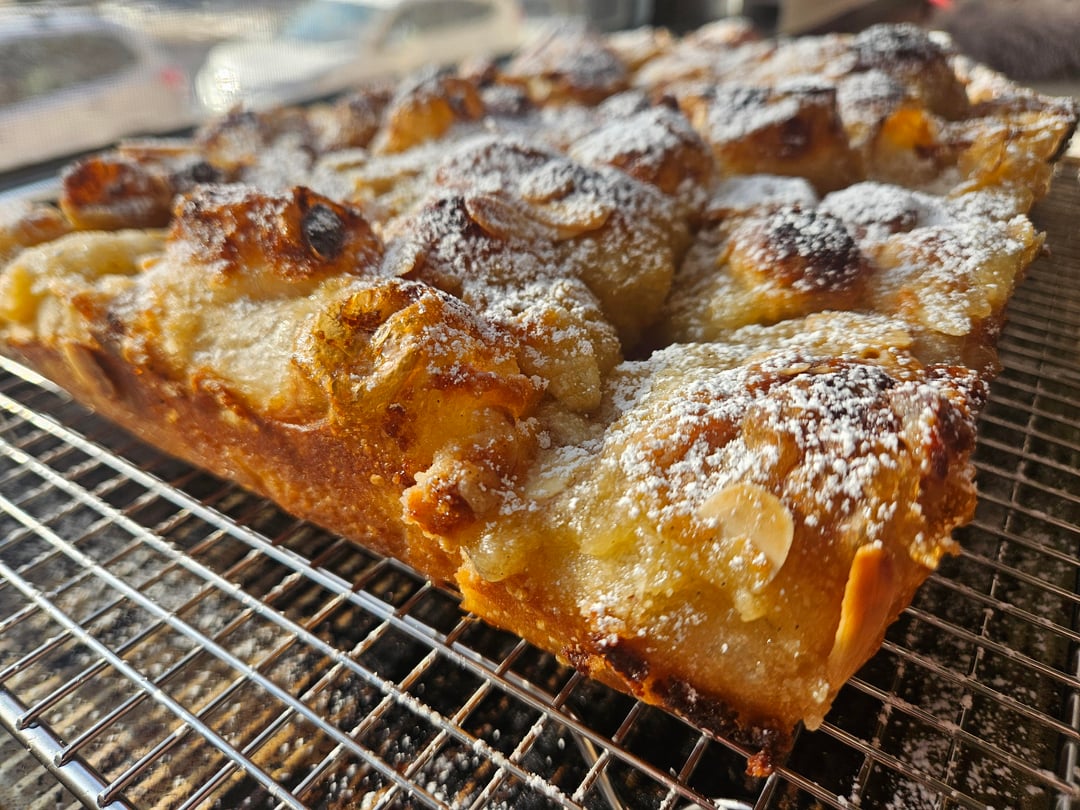 Almond simple syrup – 1/2 cup each water and sugar in a saucepan on medium high, heat until sugar is dissolved. Add ½ tsp almond extract. Brush over focaccia when it comes out of the oven.