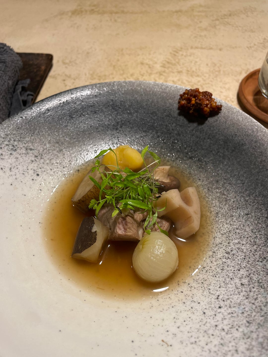 - The chef called this “like oden”, with Australian lamb and the veggies you can see yourself. There was also a bit of mustard seed paste made with paprika and tomato paste to change up the flavor. It was nice after how heavy #7 was.
